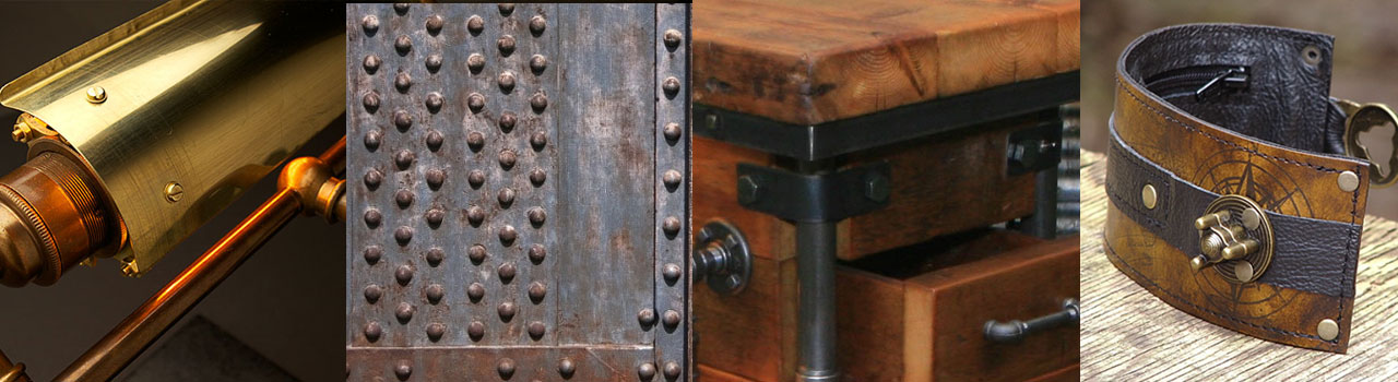 Als je het visuele aspect van Steampunk bekijkt, gebruikt men meestal een combinatie van hout, koper, goud, roestig staal en leder. Veel voorkomend zijn het zichtbare radarwerk uit klokken en koperen buizen waardoor stoom loopt. Ook de typische klinknagels van stalen structuren zoals de Eifeltoren zie je vaak terugkeren. Natuurlijk mogen we ook het staal zelf niet vergeten, dat in deze periode zijn opmars deed.