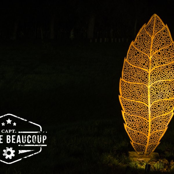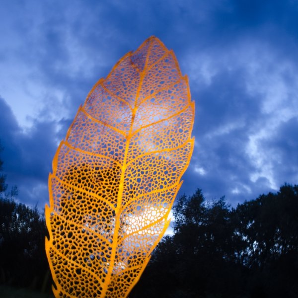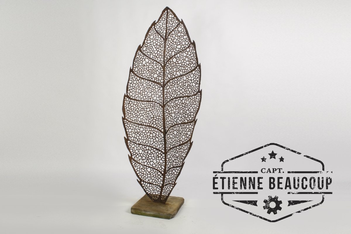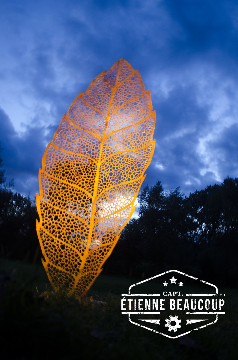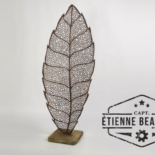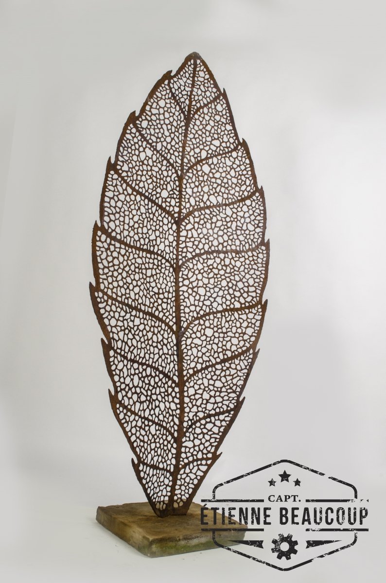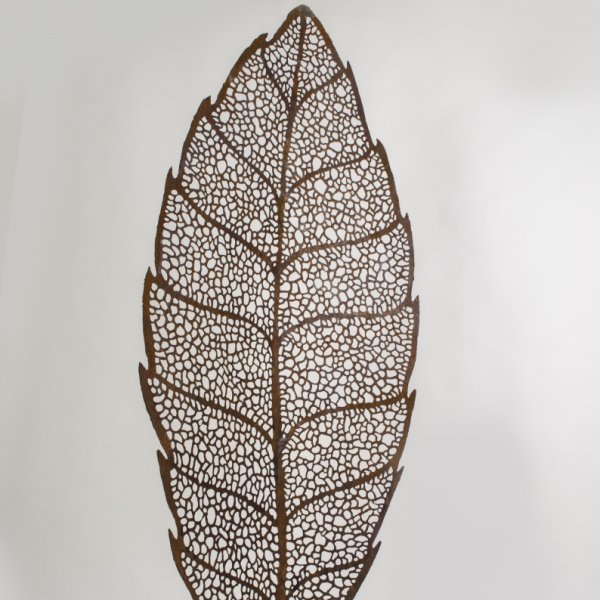 Dit blad werd met de hand uitgesneden uit een oude metalen poortdeel. Vervolgens geschuurd laten roesten en verzegeld.