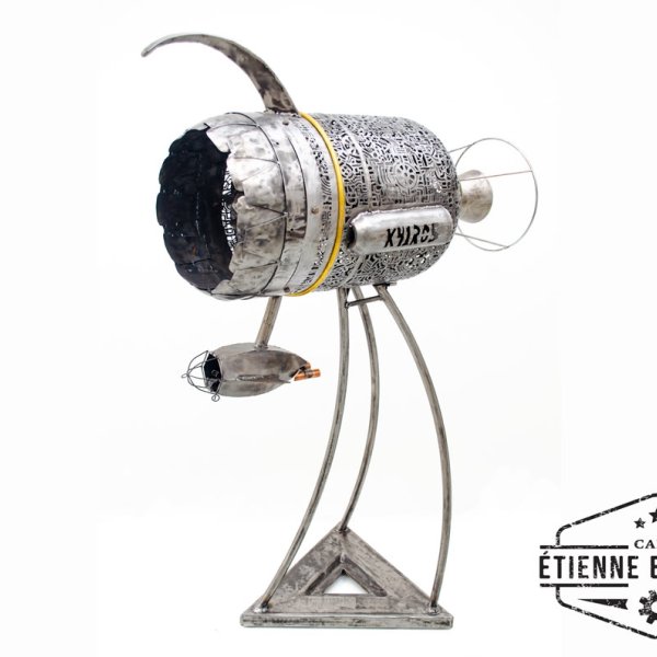 Geheel opgebouwd uit recuperatie metaal. Her ruimteschip bevat een bewegingsdetector en start radom bij detectie.