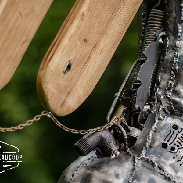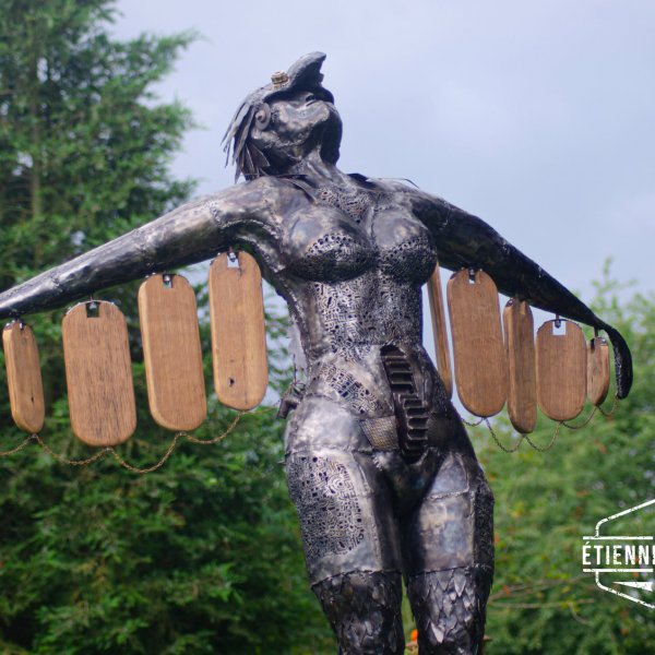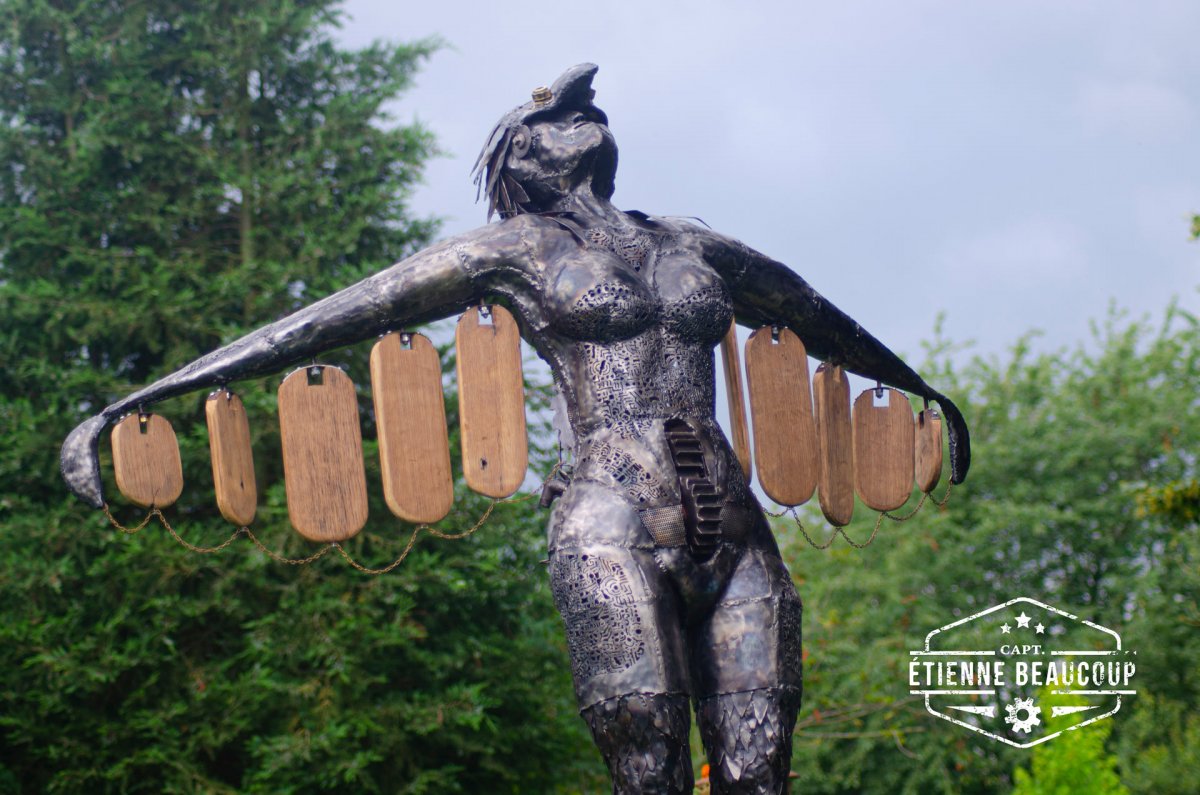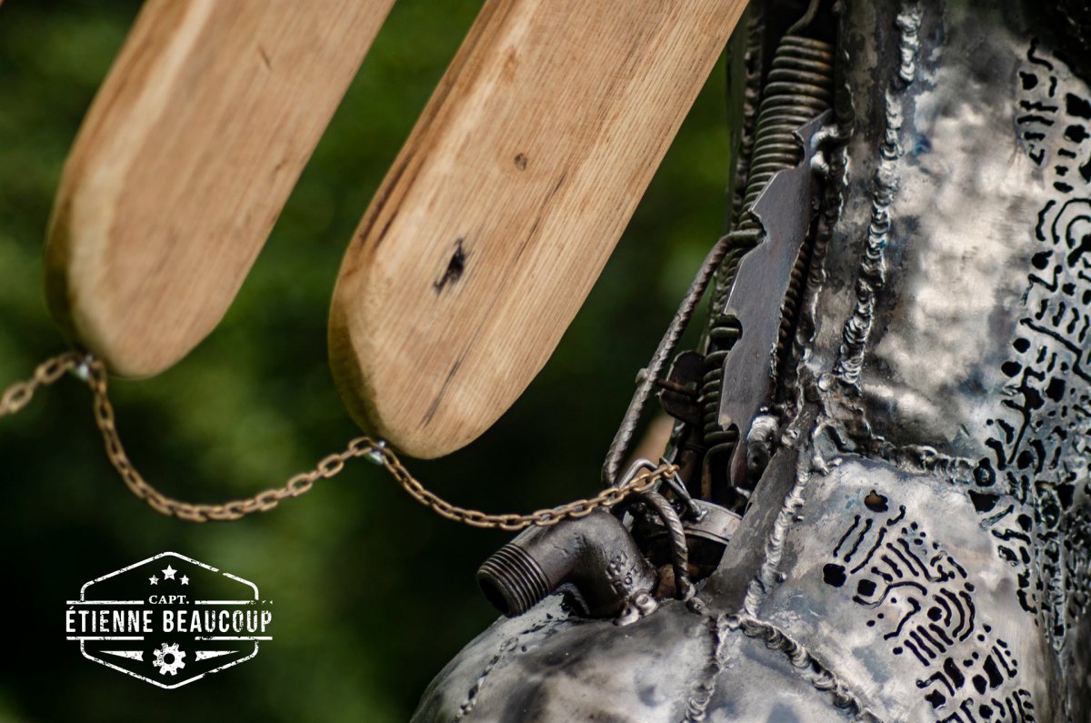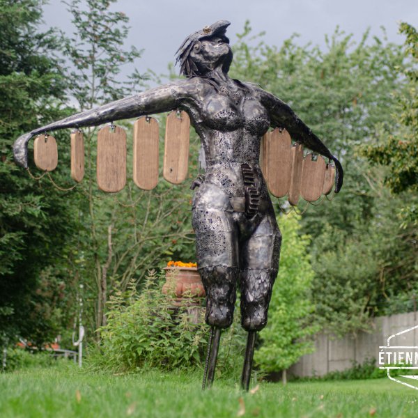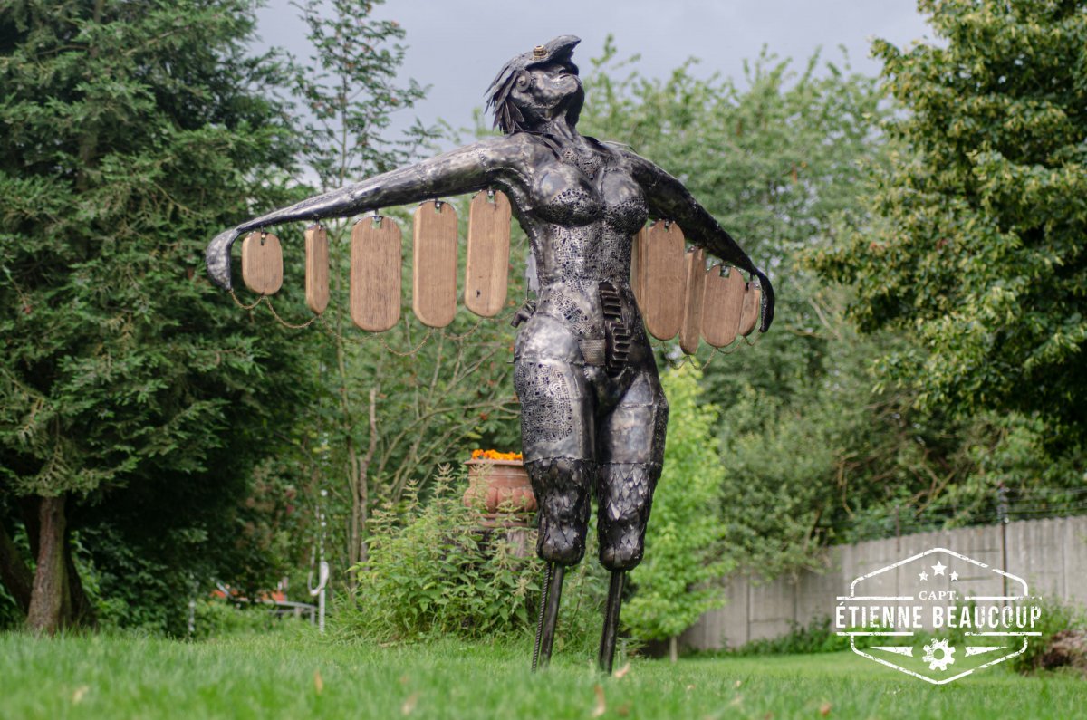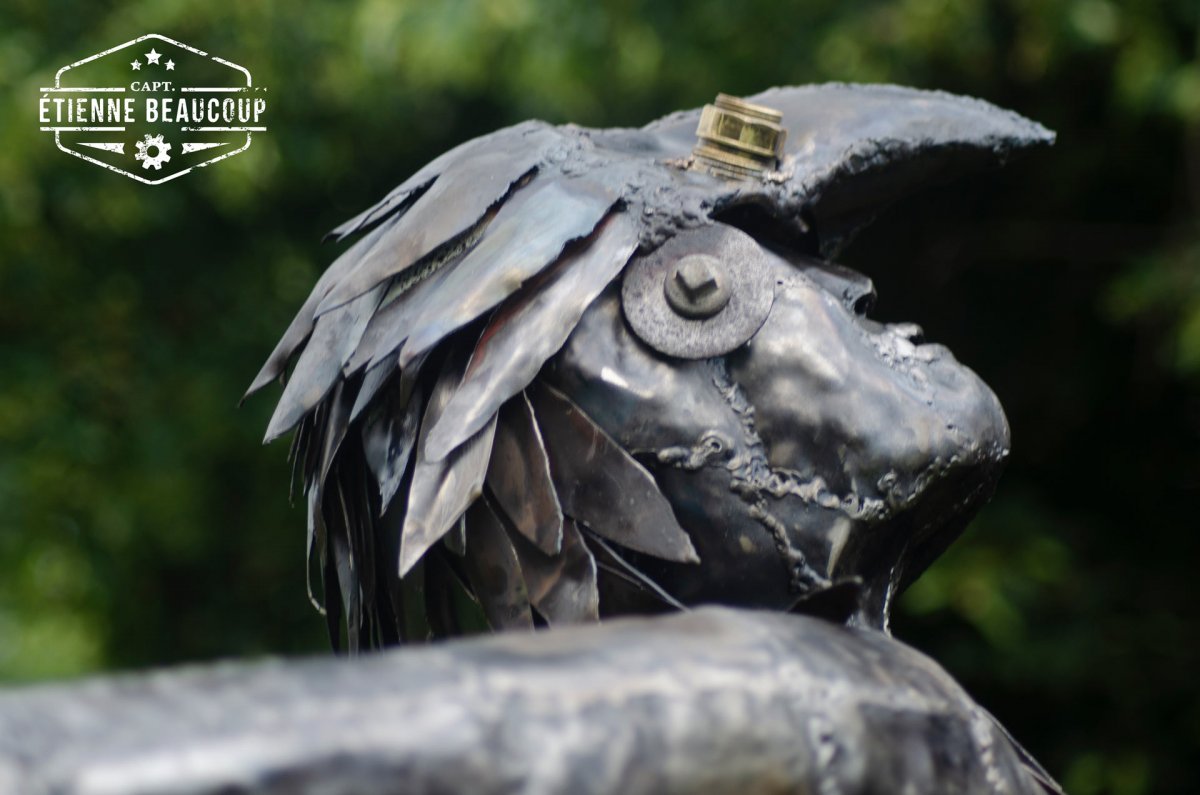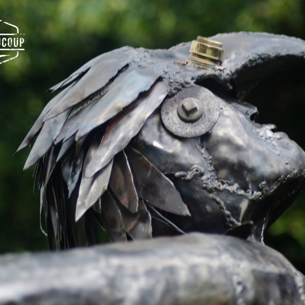 Dit werk is opgebouwd uit gerecycleerd betonijzers en oude metaalplaten. Het werk is gemaakt als tuinbeeld en zal in loop van de tijd roesten.