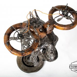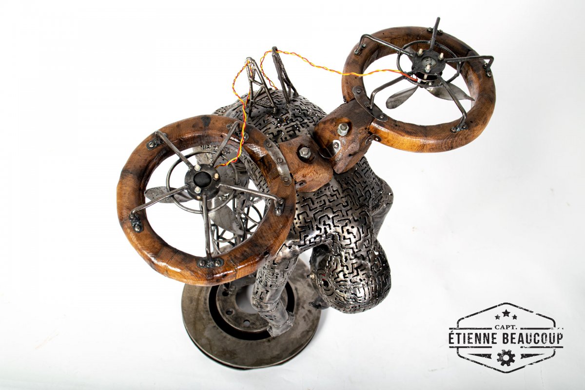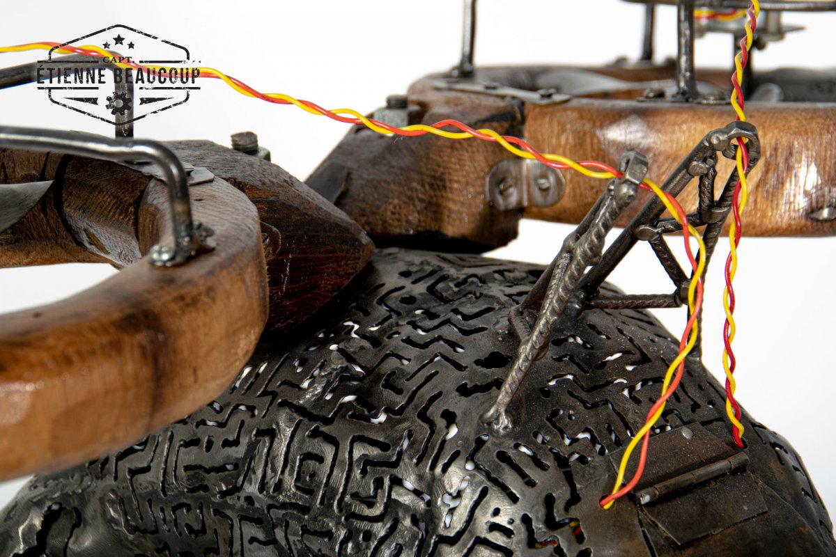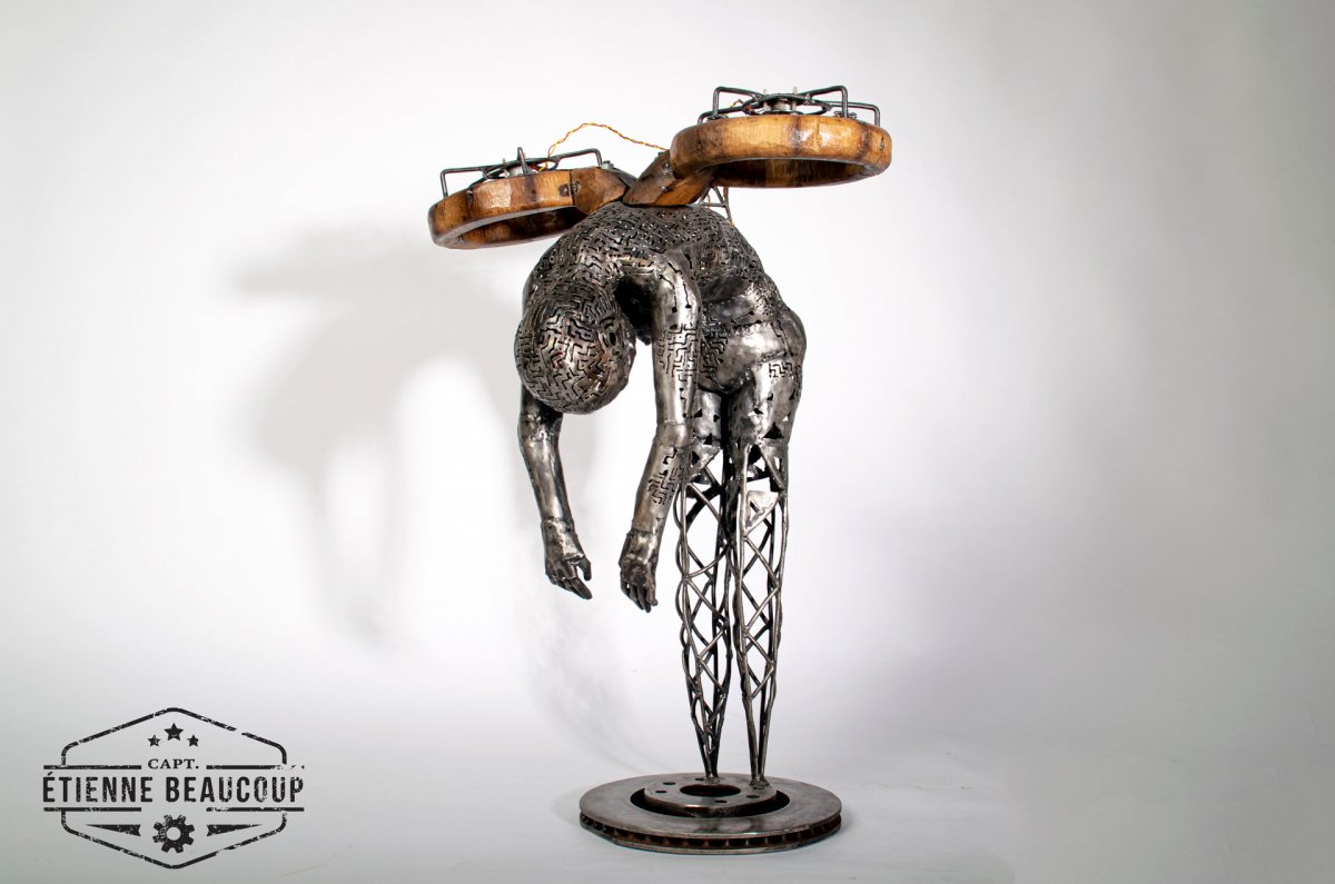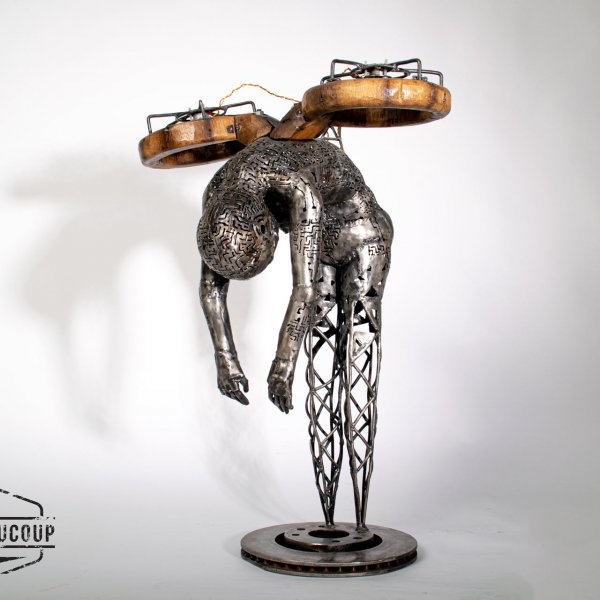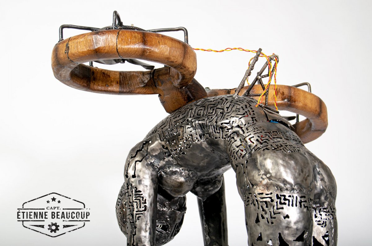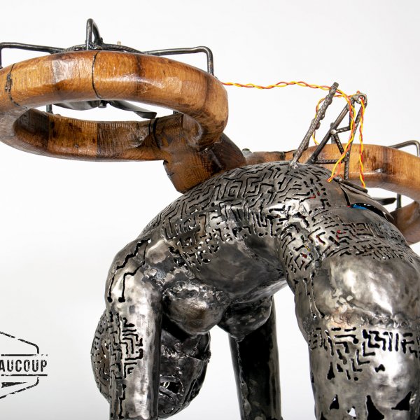 Deze sculptuur is opgebouwd uit gereupereerd staal en sloophout.