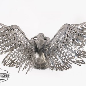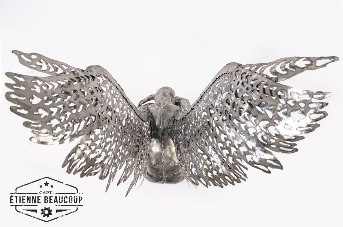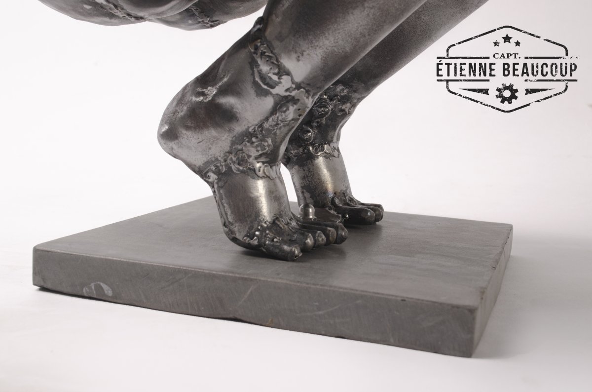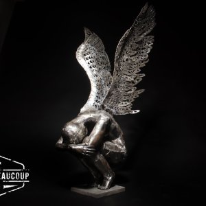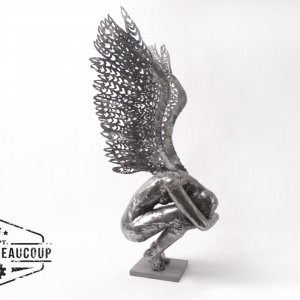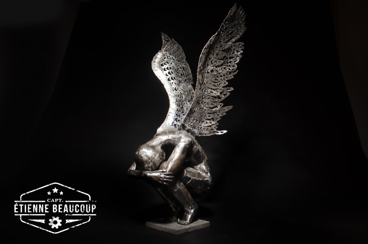 Deze vrouwelijke engelfiguur in hurkende pose is volledig gemaakt uit gerecupereerde metalen platen van een oude locker. Door elk stukje metaal te hameren tot het de perfecte vorm heeft en vervolgens aan elkaar te lassen.