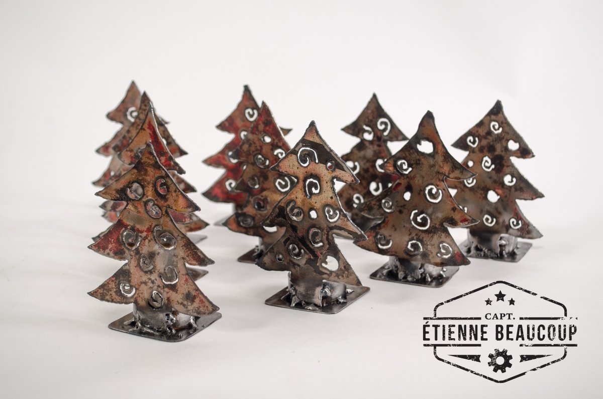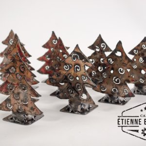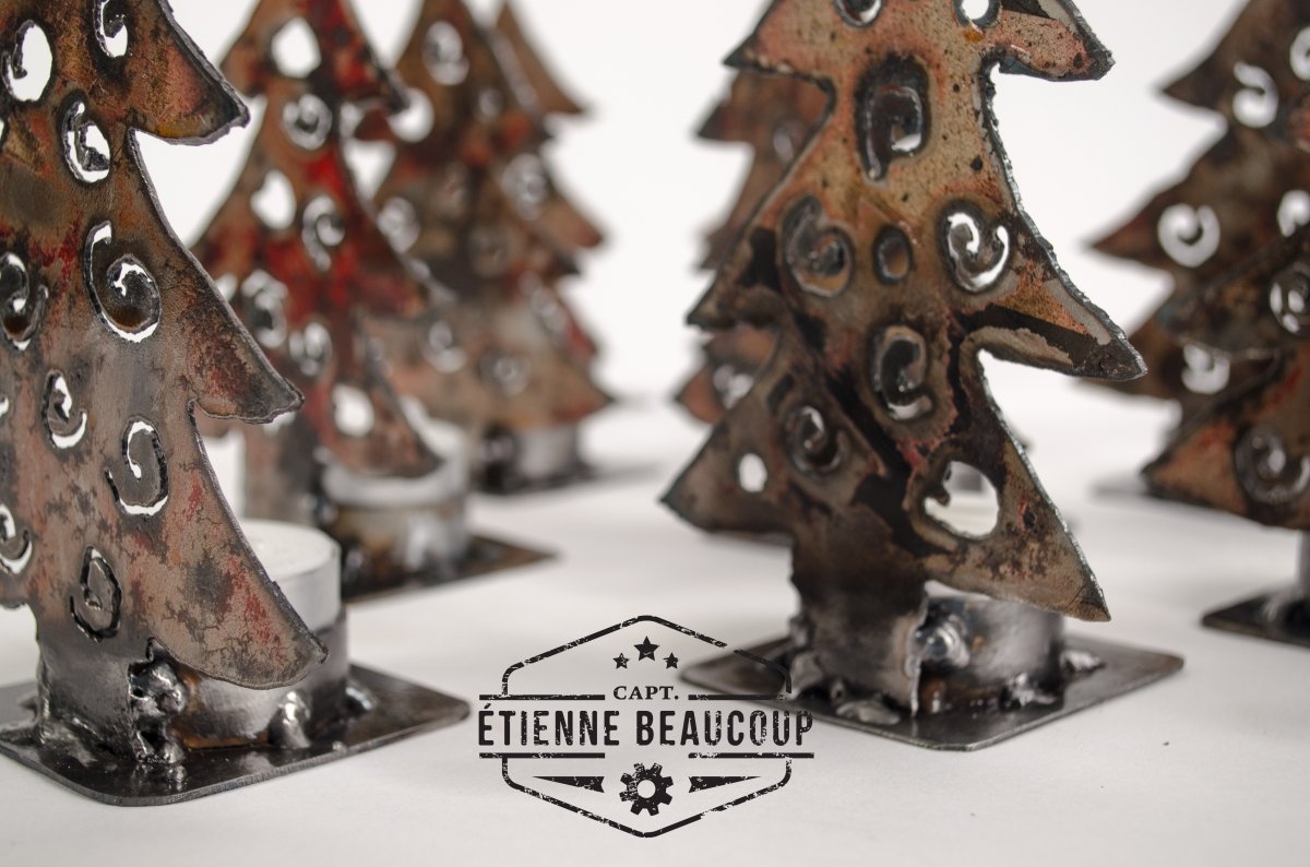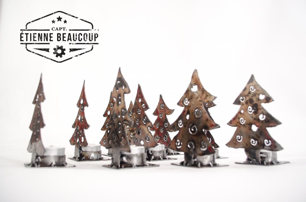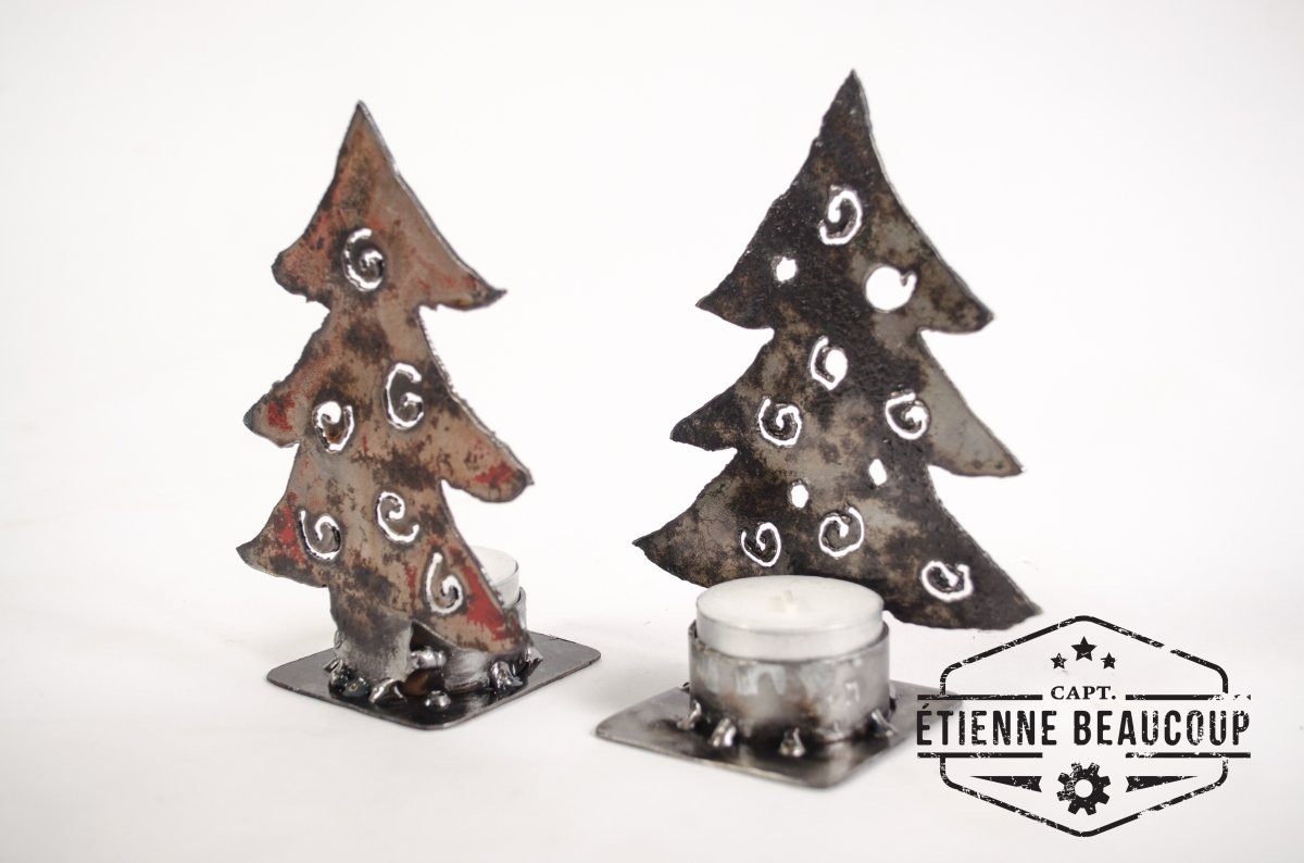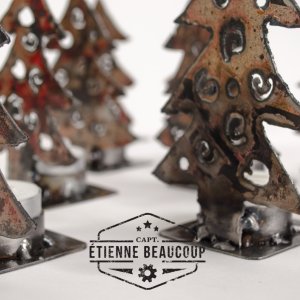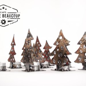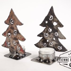 Theelichthoudertjes met kerstboom gemaakt uit een oude versleten verkeersbord. Speciaal niet geheel afgeschuurd om nog de rode/witte en groene tinten een beetje te bewaren.
