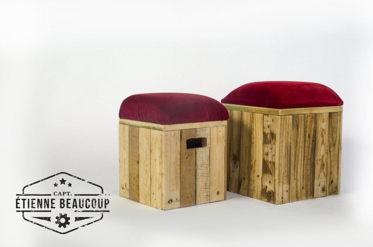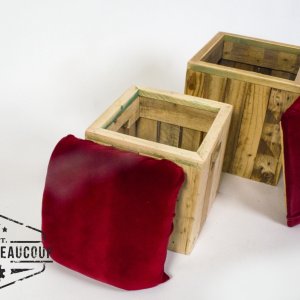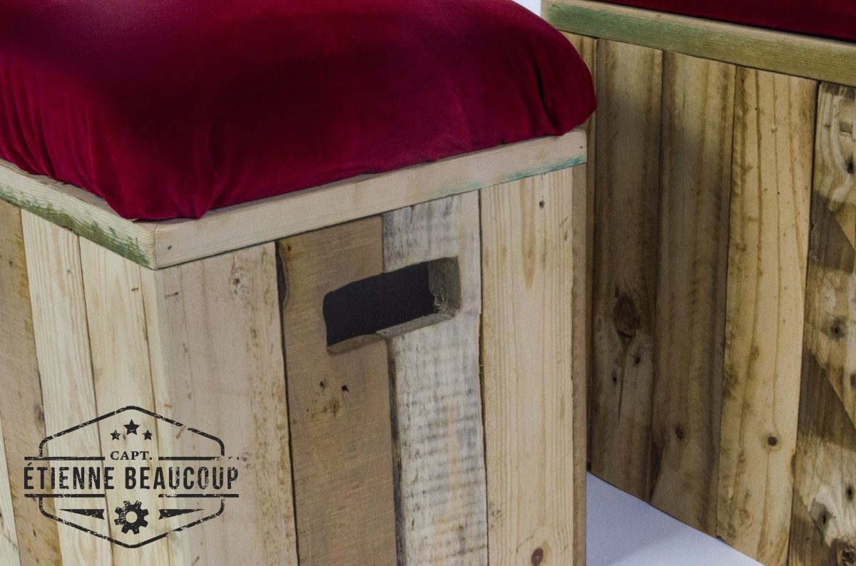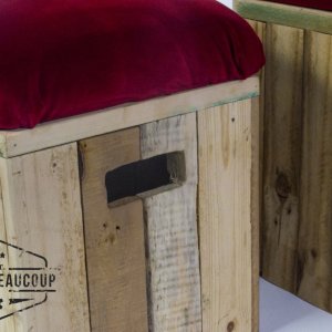 This small sittingbox with handles is made from reclaimed wooden pallets. Finished with garden furniture oil. The seat is a piece of an old velvet curtain. The seat can be taken of and can be used as a box.