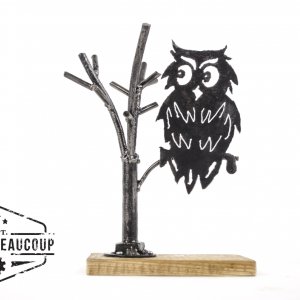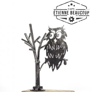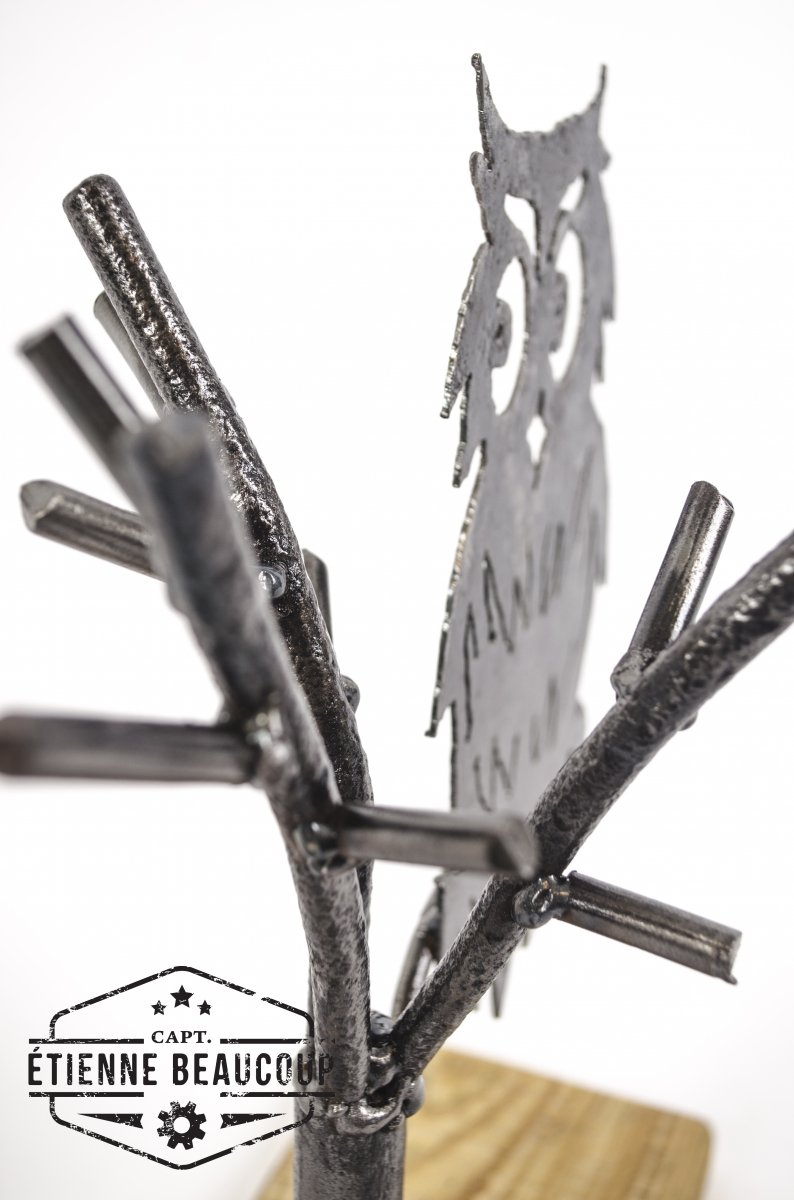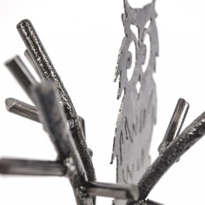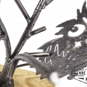 Dit decoratief beeld werd met de hand uitgesneden uit recuperatiemetaal. De boom is opbebouwd uit stukjes herbruikt betonijzer op een stam van een dikke bout.