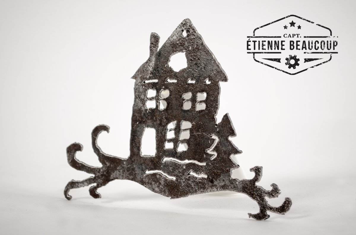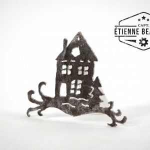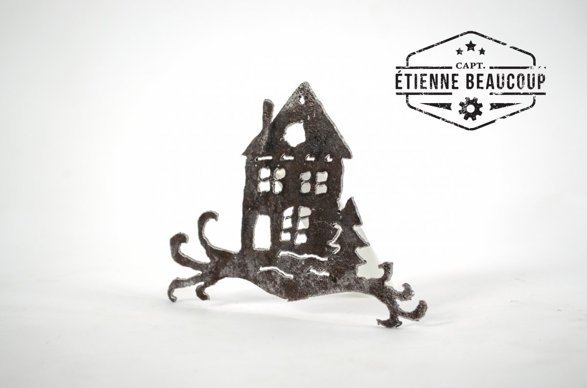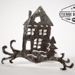 Een klein huisje in de sneeuw uitgesneden uit een metalen plaat. Het kan eventueel nog op een voetje worden gelast of gewoon om in de kerstboom te hangen.