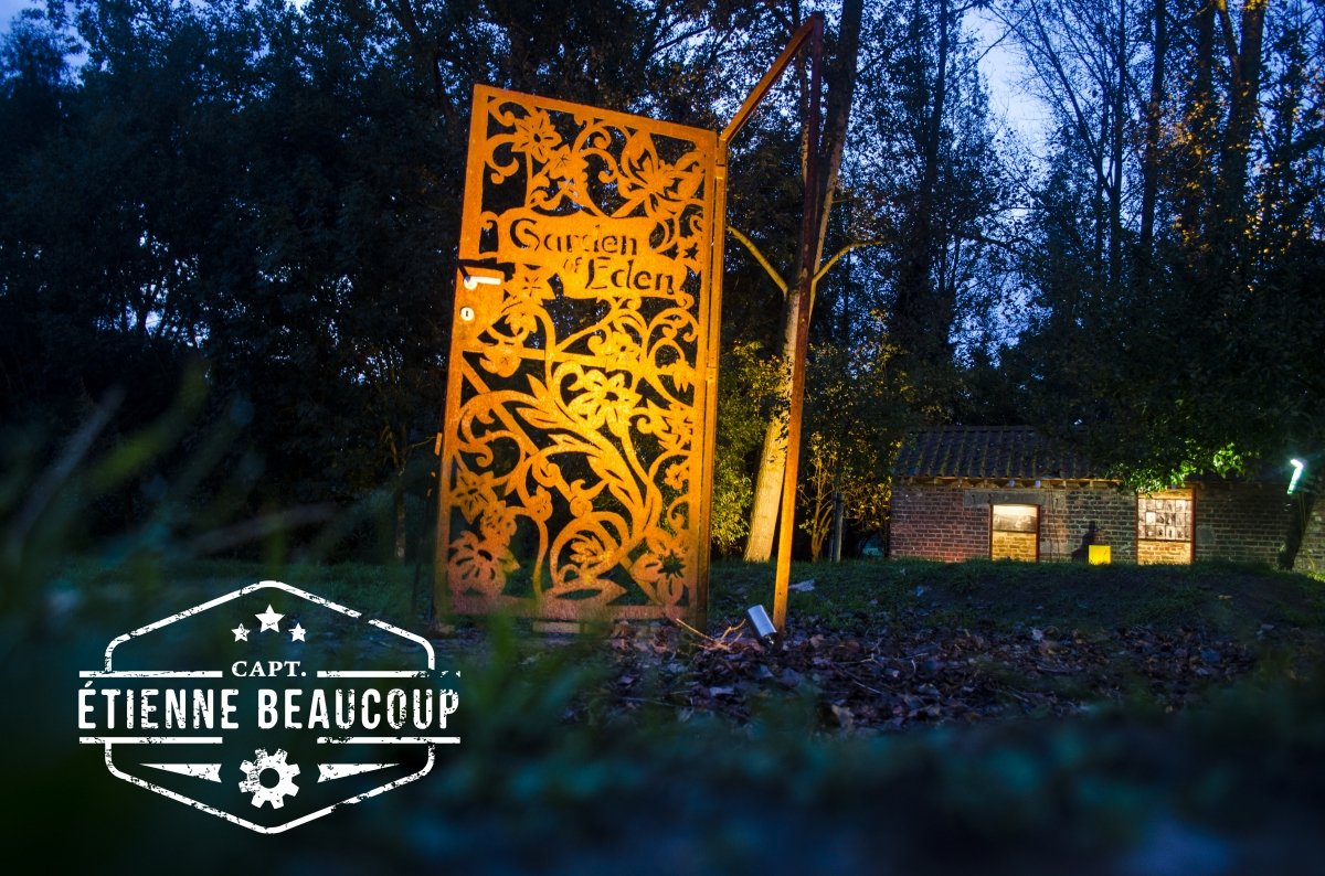 Een unieke sculpturale ligstoel van trampolinebuizen en pallethout, bekroond met een lantaarn uit een oud expansievat voor een dromerige reis naar de sterren.