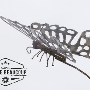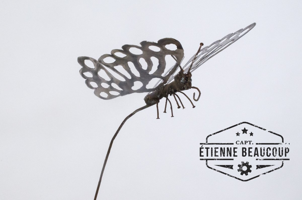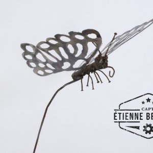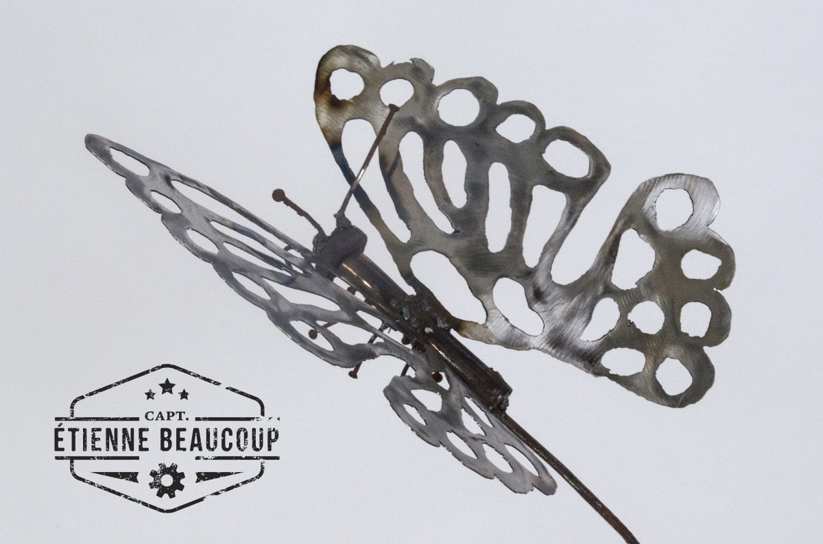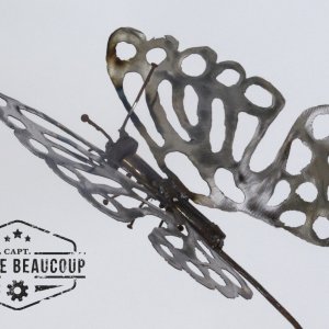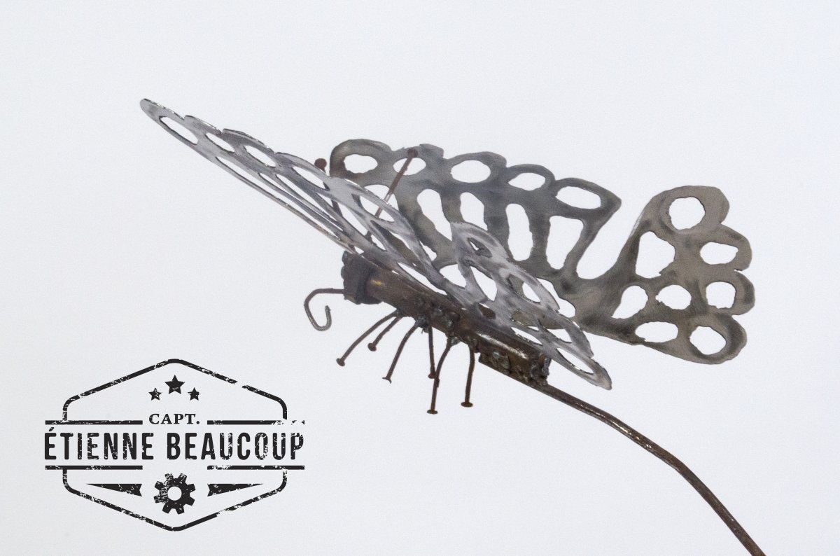 Deze vlinder is volledig gemaakt uit stukken afval metaal zoals oude nagels, een bout. de vleugels zijn met de plasmacutter uit een gerecupereerde metalen plaat gesneden.