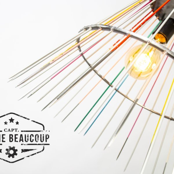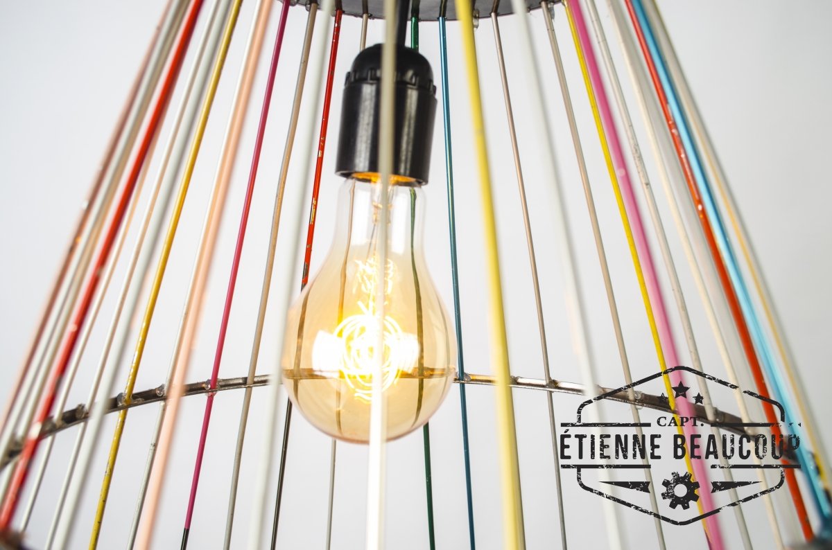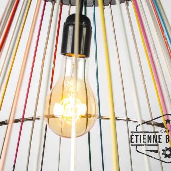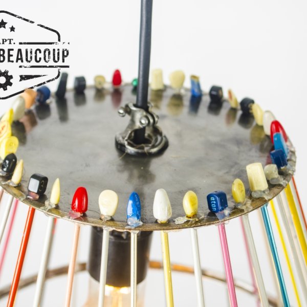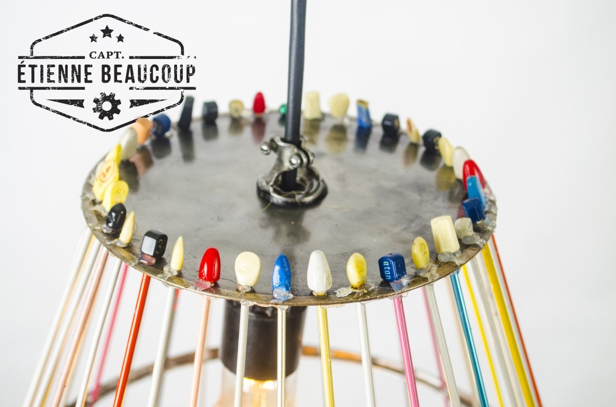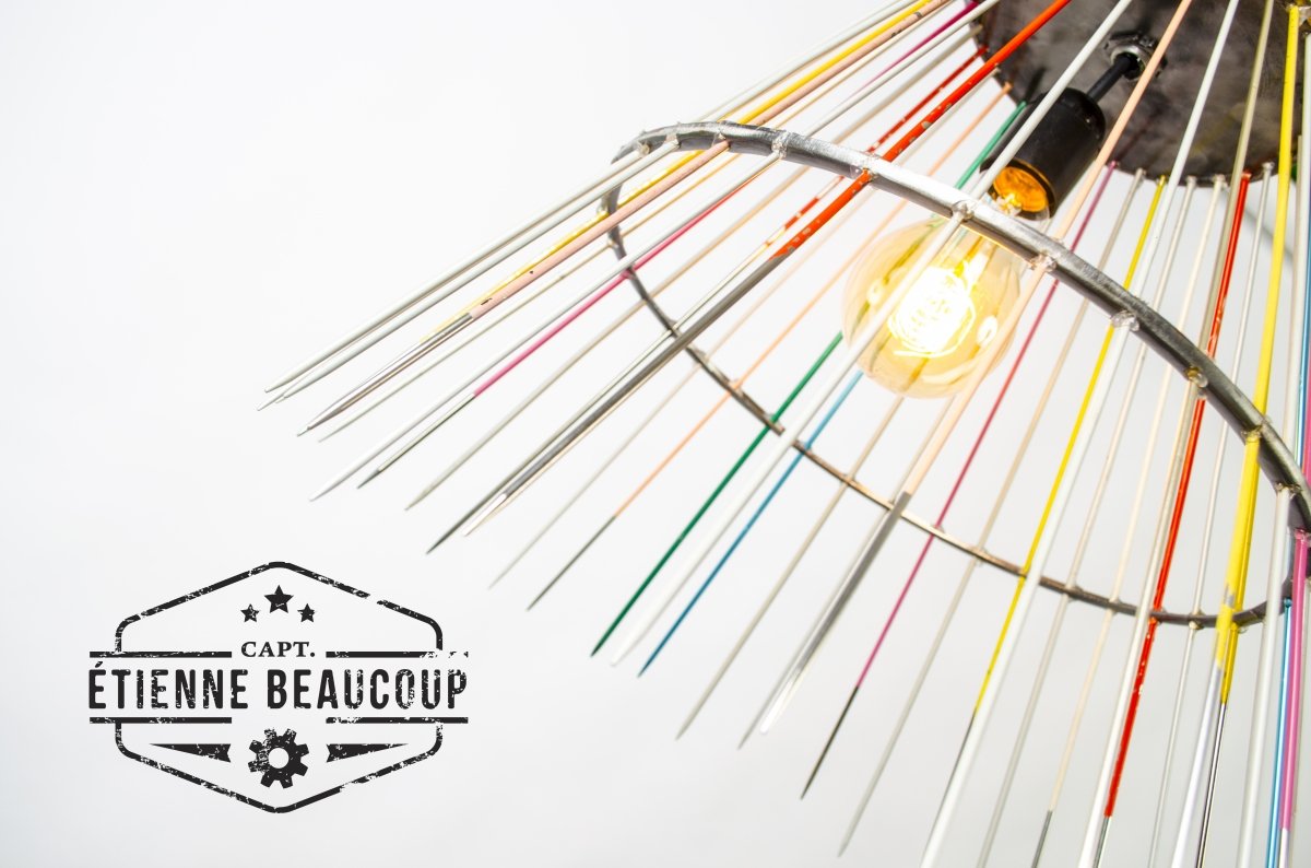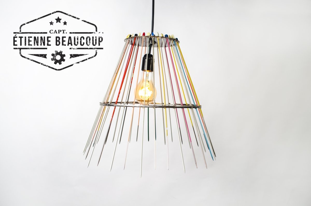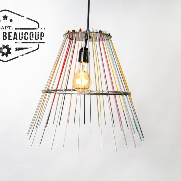 Deze unieke hanglamp is gemaakt uit een verzameling kleurrijke breinaalden die van de vuilnisbak gered zijn. De bovenste ring is een oude slijpschijf, de grote onderste ring is een stuk van een oud expantievat.