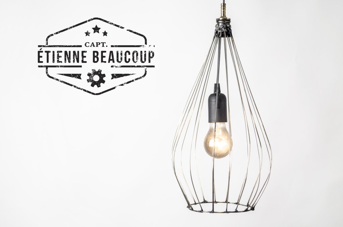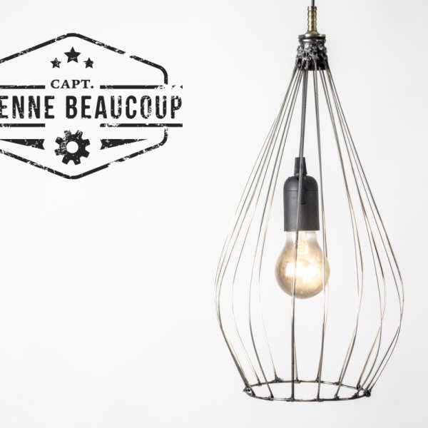 Deze hanglamp is gemaakt uit inox breinaalden die zachtjes werden gebogen. Het is een eerste poging om een cagelamp te creëren. de naalden lieten zich echter niet zo eenvoudig buigen en smelten gemakkelijk weg bij het lassen, daardoor is de lamp niet mooi symmetrisch.