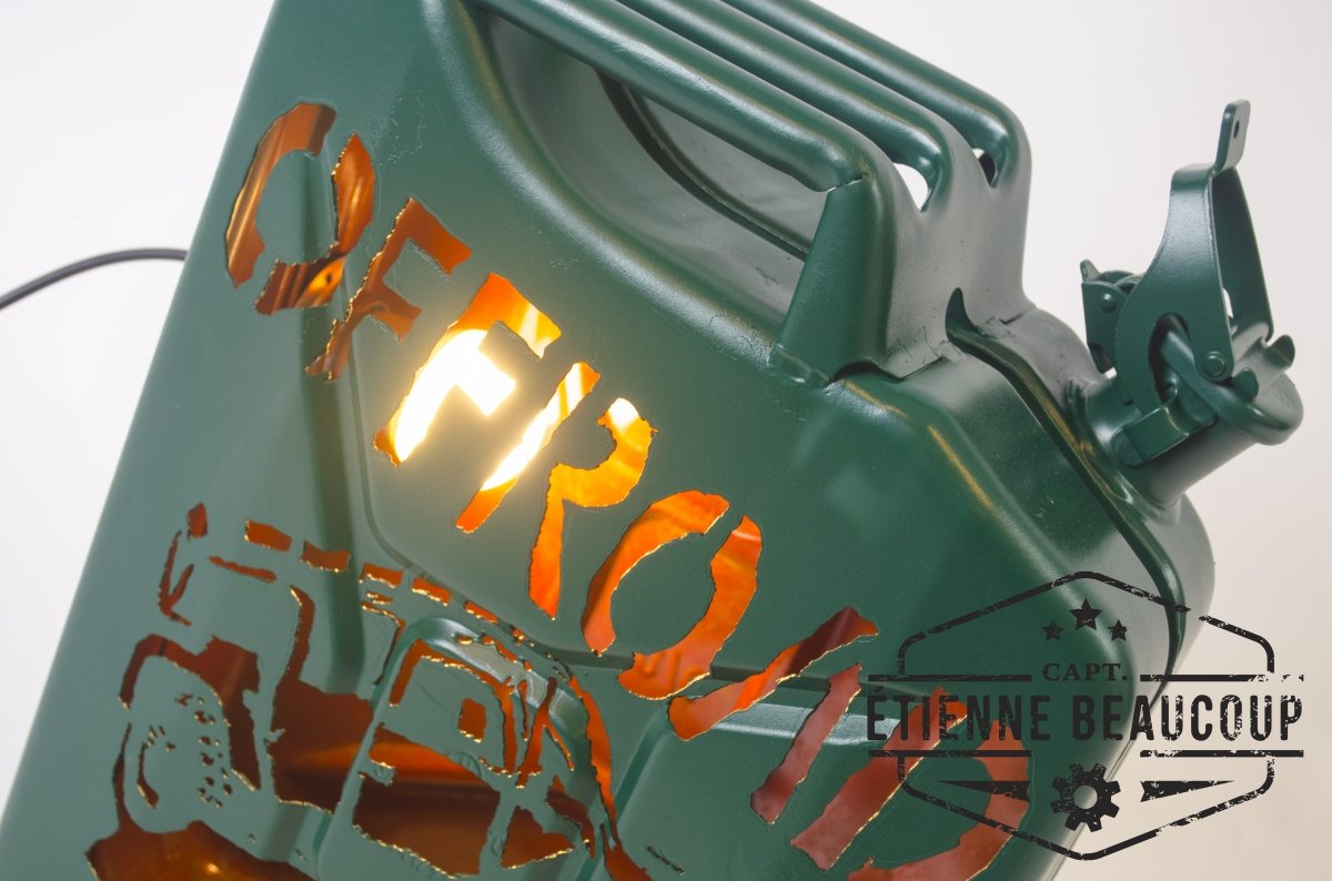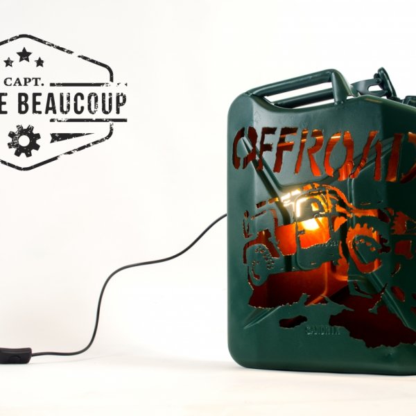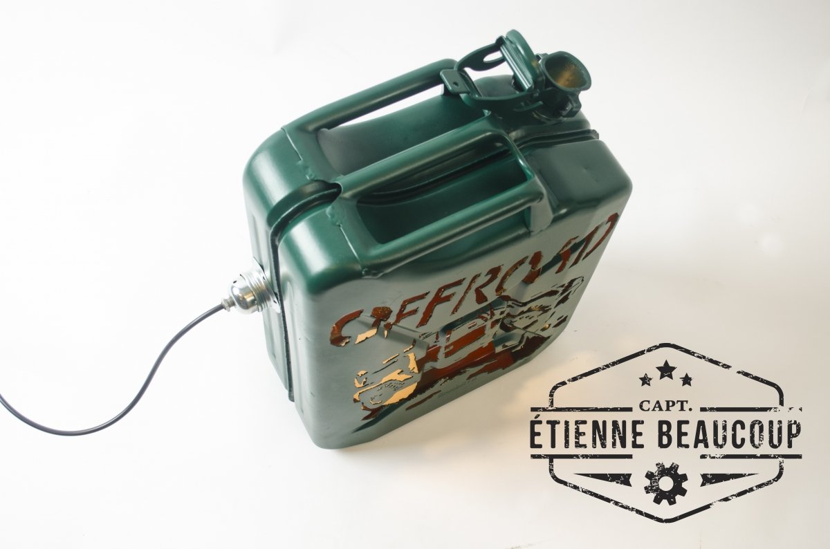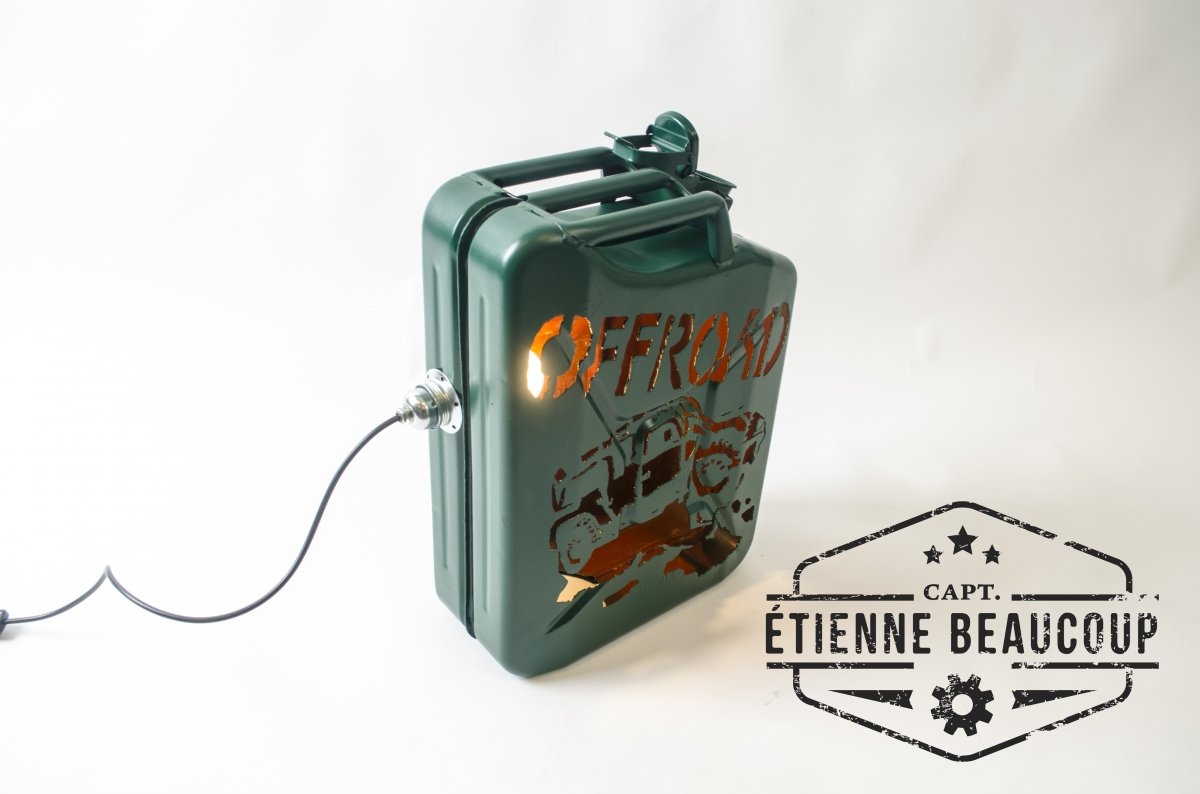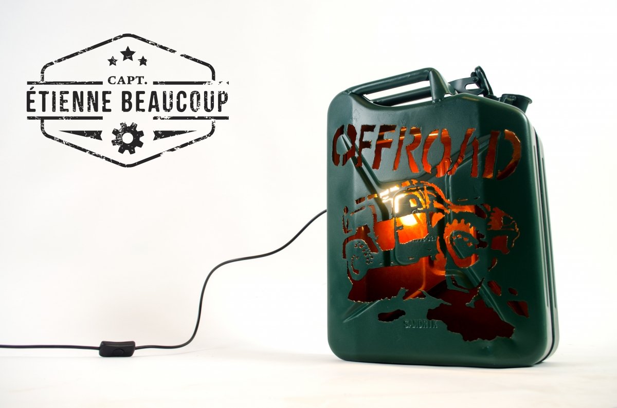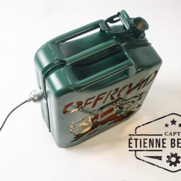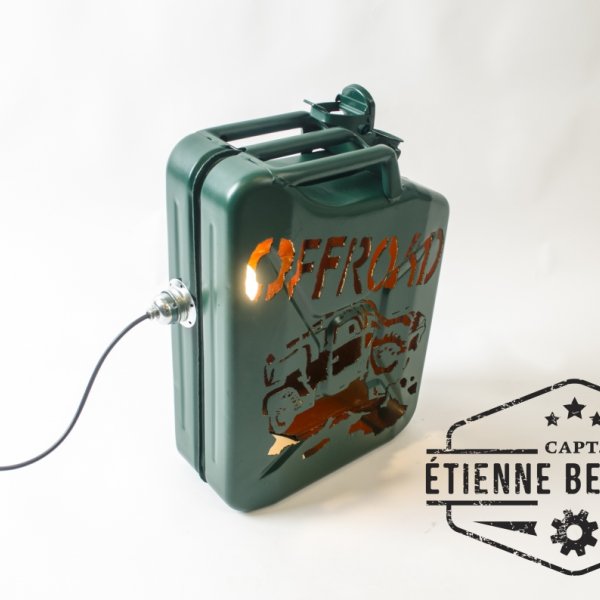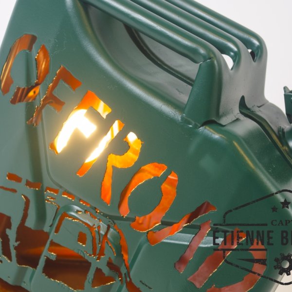 Deze sfeerlamp is gemaakt uit een oude afgedankte metalen jerrycan. De tekening is er met de hand uitgesneden met een plasmacutter. de ruwheid van de tekening geeft perfect het offoad gevoel weer.