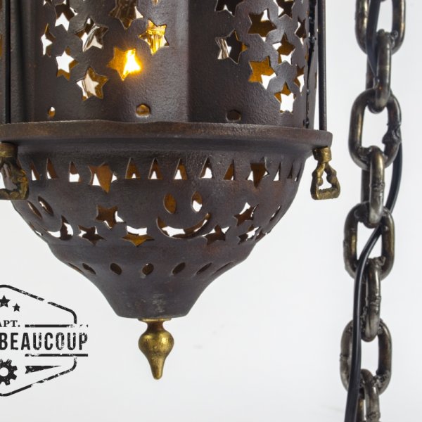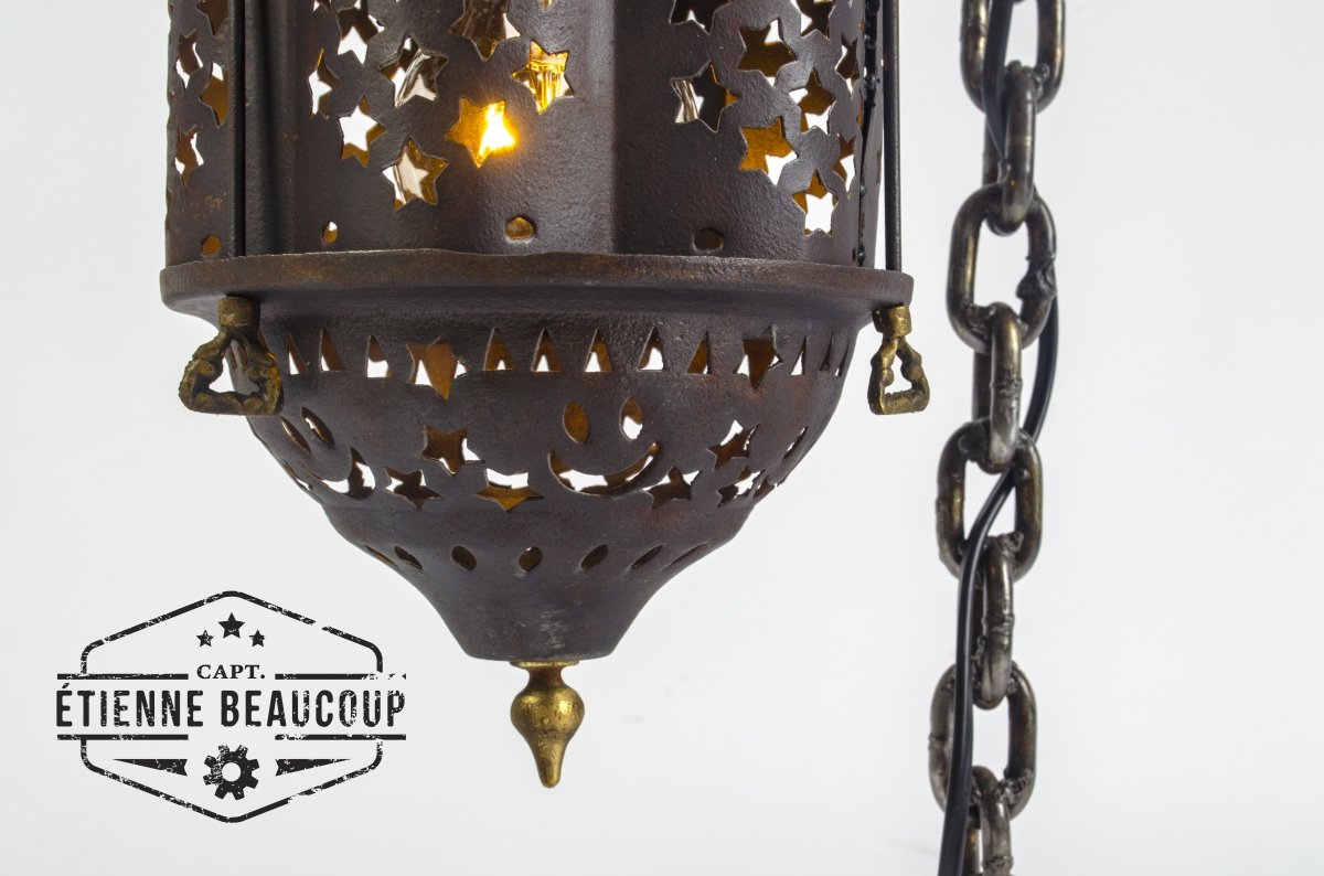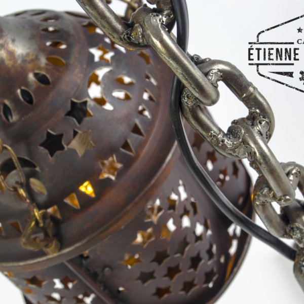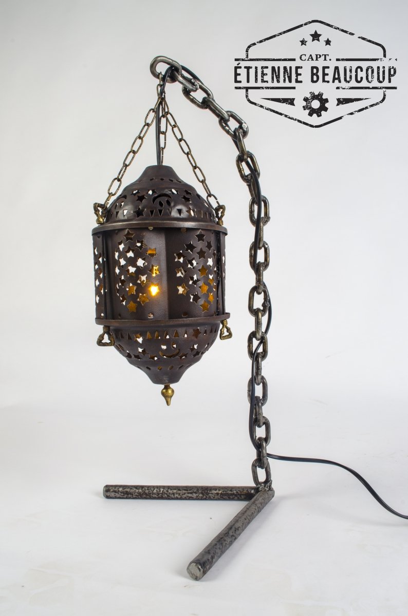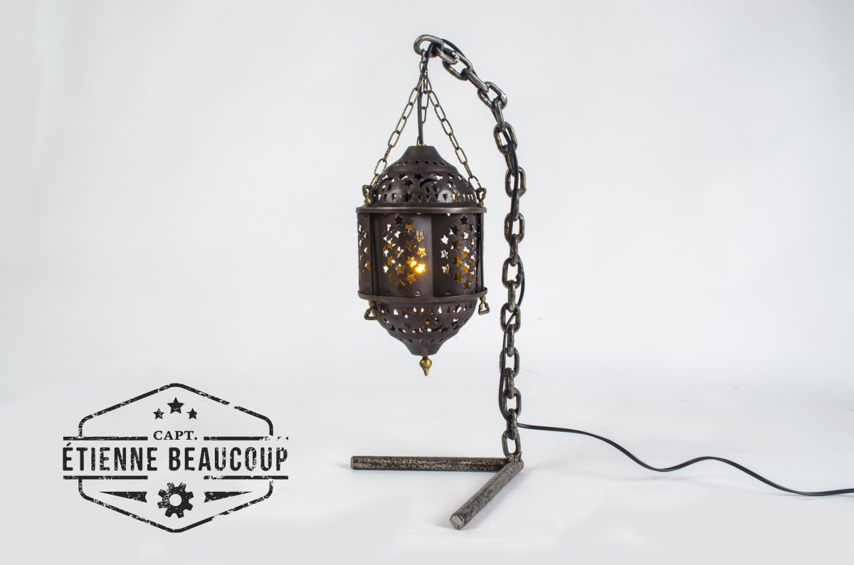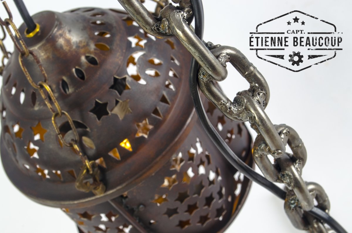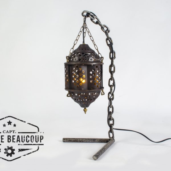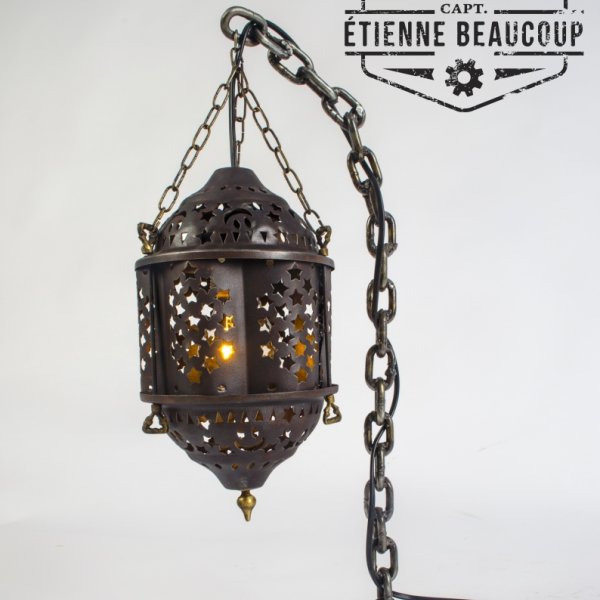 Een oud stuk ketting werd de basis van deze lamp. De aan elkaar gelaste schakels voormde een leuke staander. Ze was al even afgewerkt, maar ik had niet meteen een idee wat ik zou aanhangen van lamp. Tot ik bij het ordenen van mijn atelier op deze prachtige oude lamp stootte die ik ooit eens van een vriend cadeau kreeg.De lamp was helemaal verroest en ik vreesde een beetje voor het dunne metaal, maar na een beetje schuren en poetsen zag ze er perfect uit. Het hier en daar wat modificaties werden beide delen perfect verenigd. De naam Thuribulum kwam al vrij snel in mij op, aangezien deze lamp mij sterk doet denken aan een wierookvat. Al is dit eerder eentje voor in een donkere punktempel dan een gothische kerk.