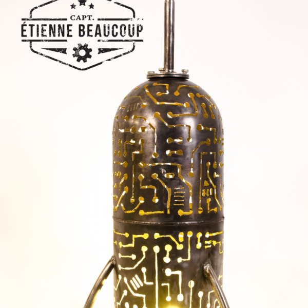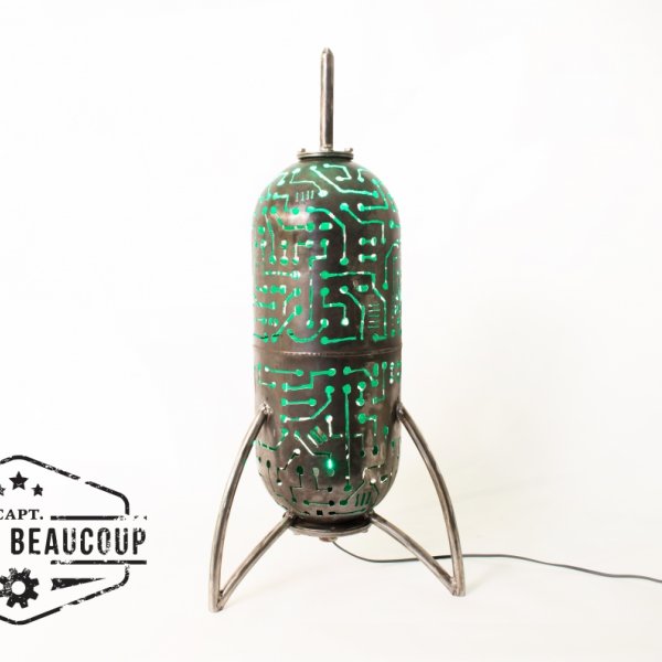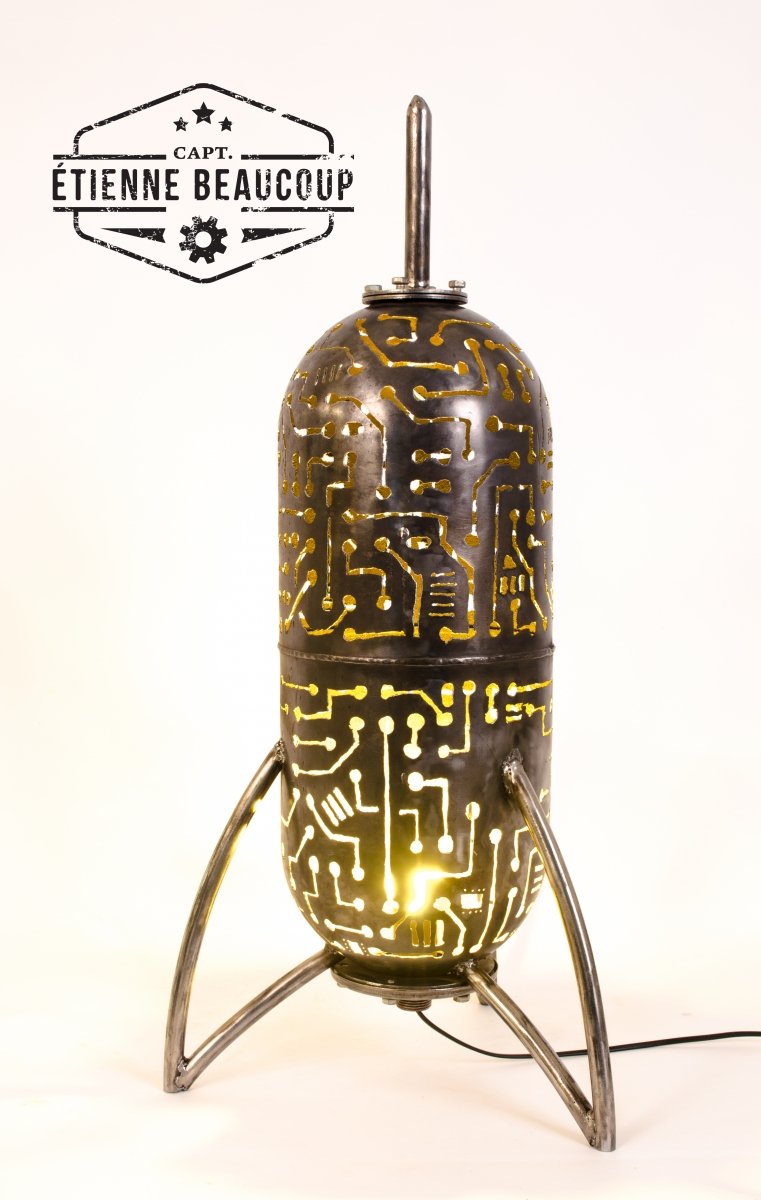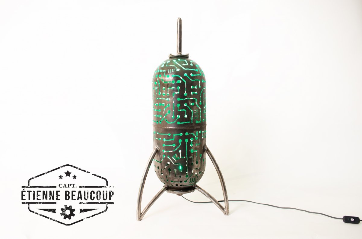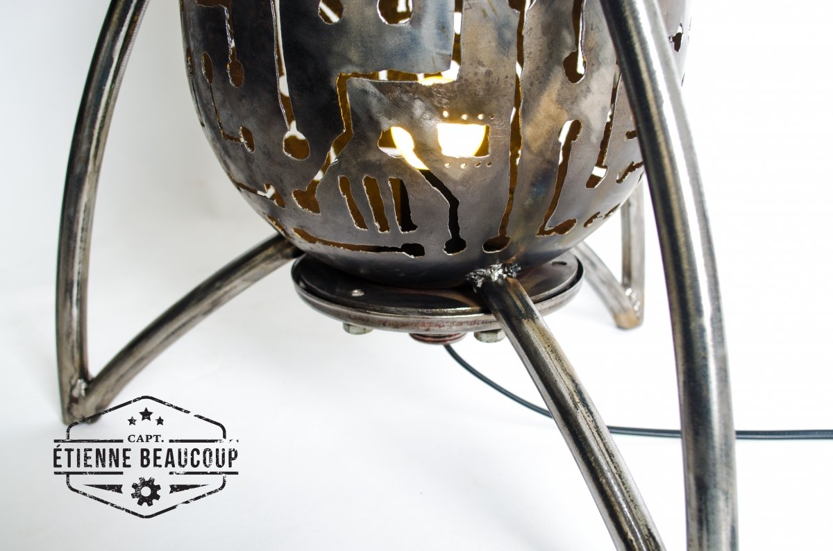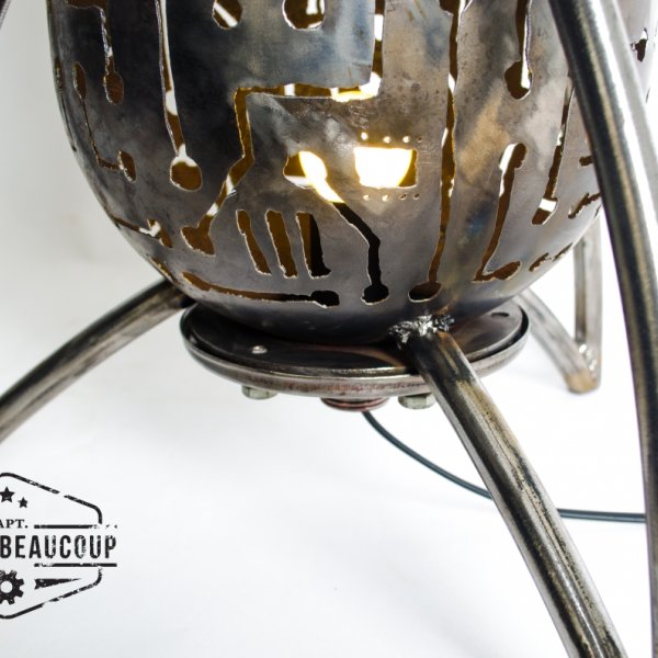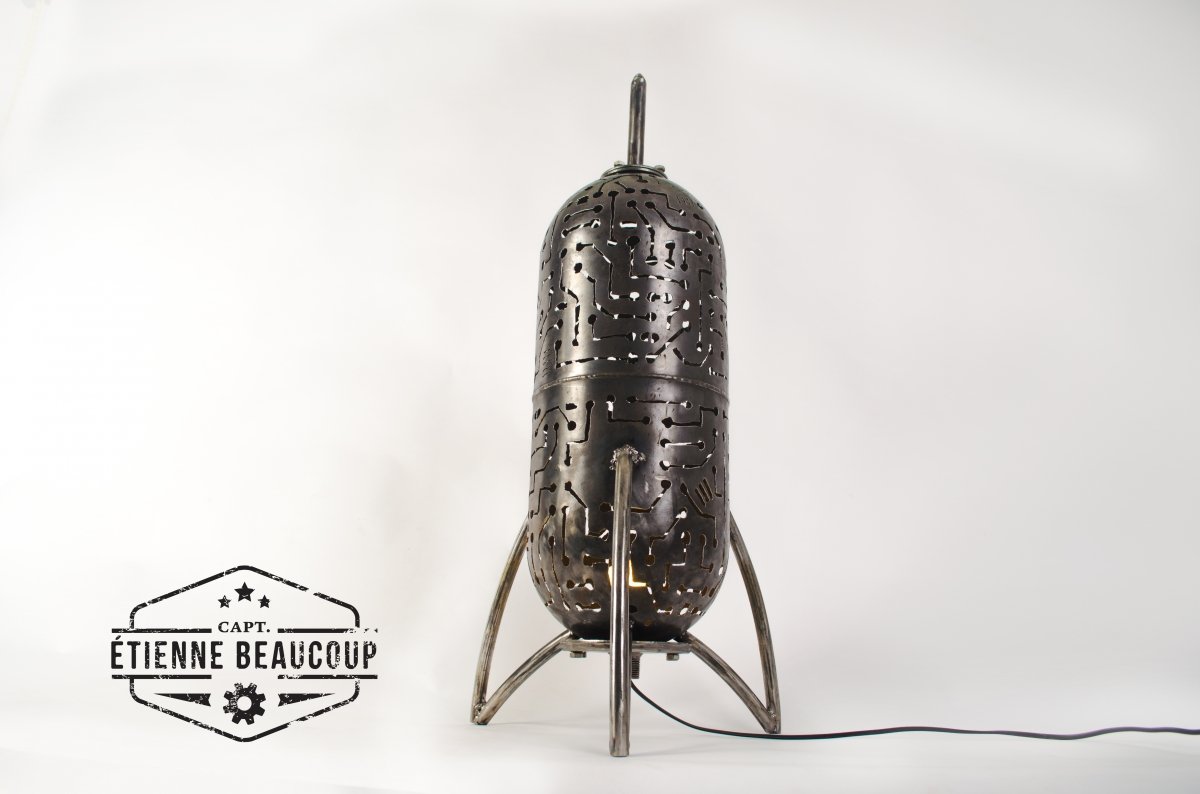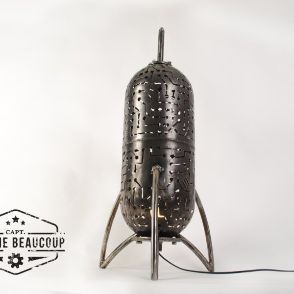 Deze retrofuturistische sfeerlamp is gebouwd uit een oud expansievat van een waterpomp. De tekening werd met de hand getekend en uitgesneden met de plasmacutter.De lampvoet is een normale E27 socket, zodat verschillende lampen mogelijk zijn.Het beste resultaat hadden we met een kleurwisselende ledspot.