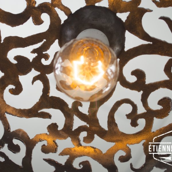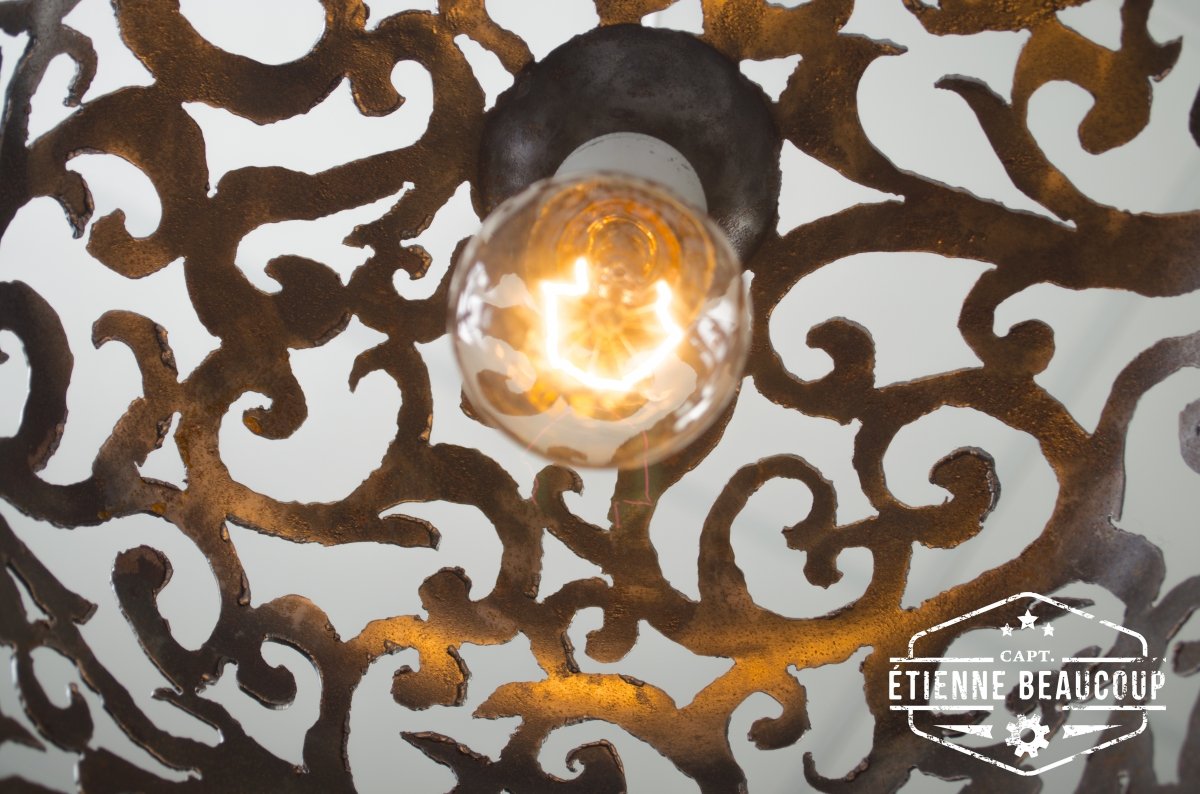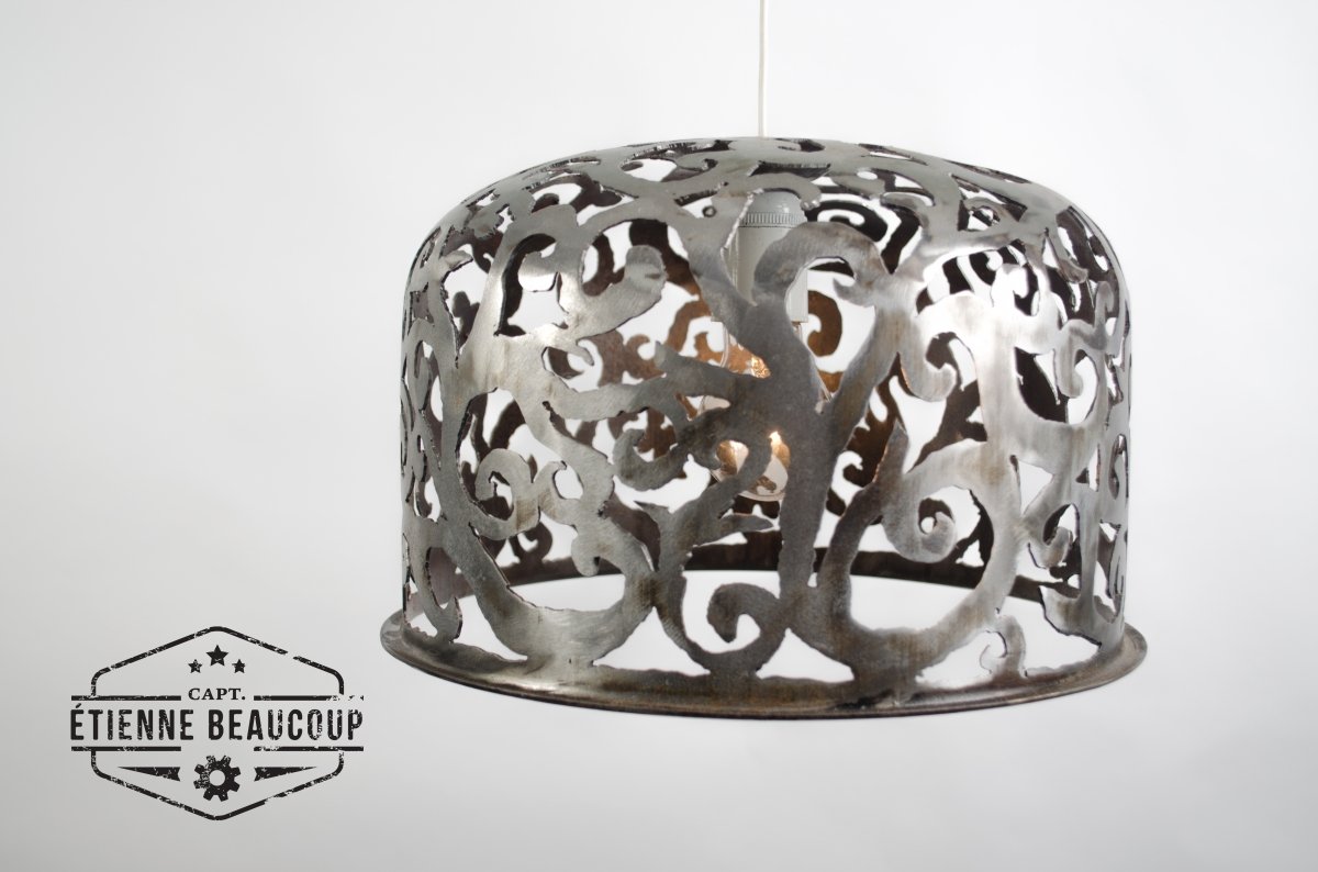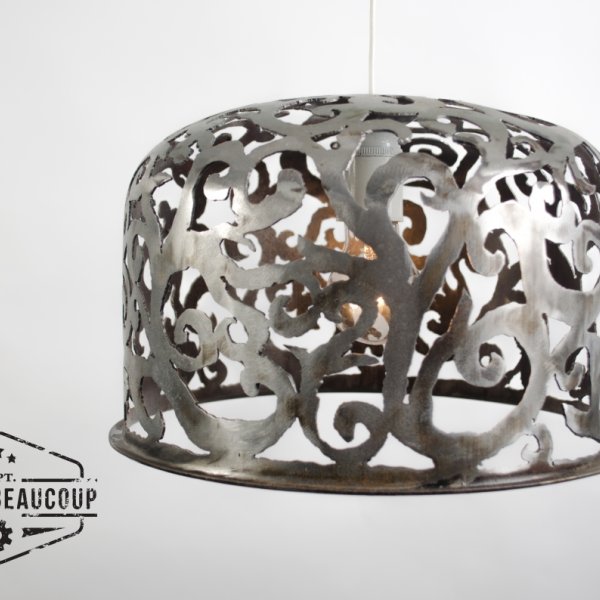 Hanlamp uit een oud expansievat van een verwarming. Met de hand uitgesneden met de plasmasnijder.