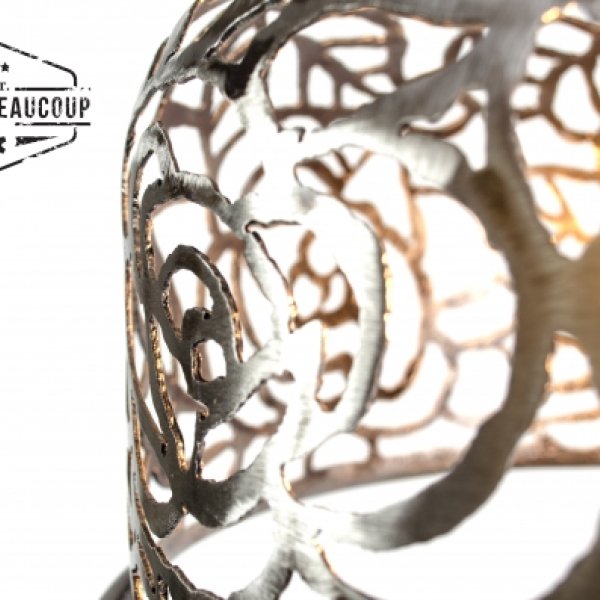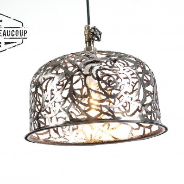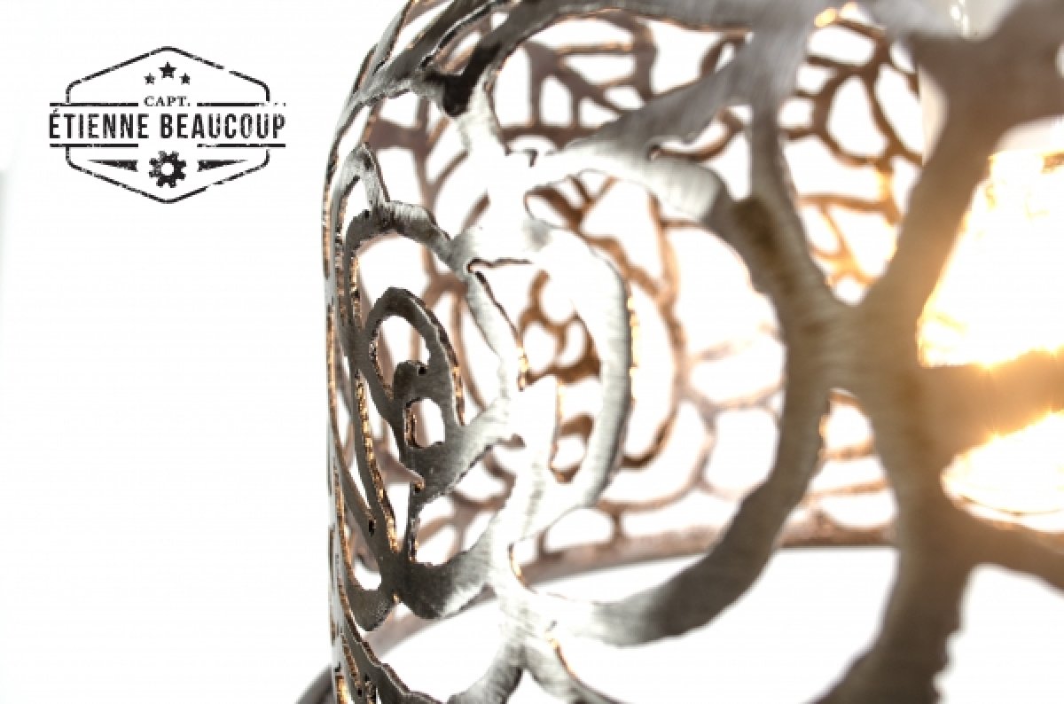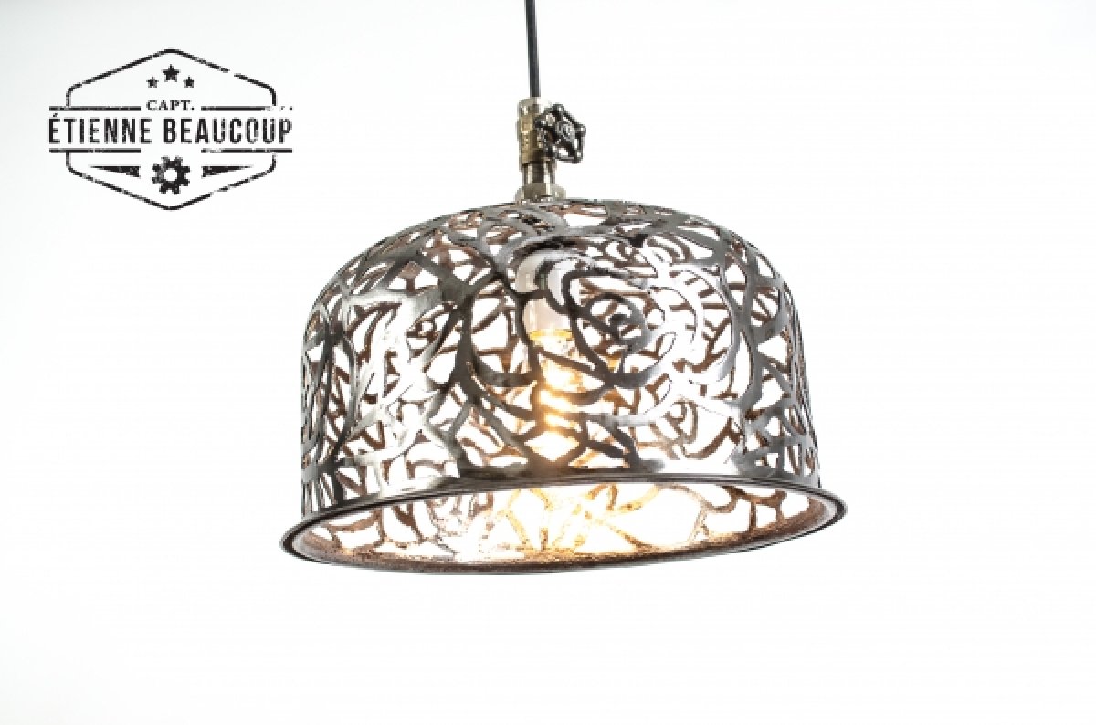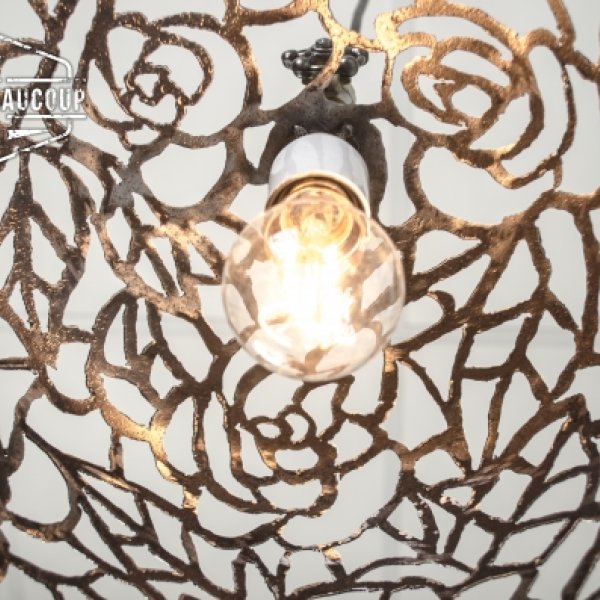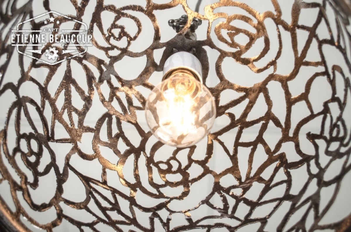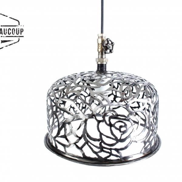 Hanglamp uit een oud expansievat. De rozen zijn handmatig uitgesneden met de plasmasnijder.