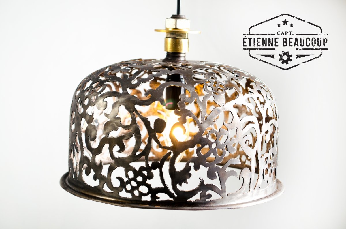 Deze hanglamp uit een oud expansievat heeft een met de hand uitgesneden damask motief.