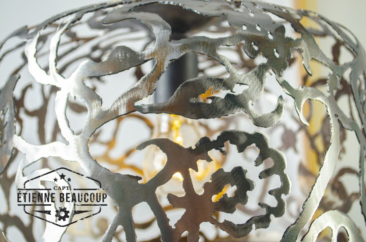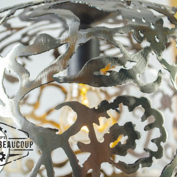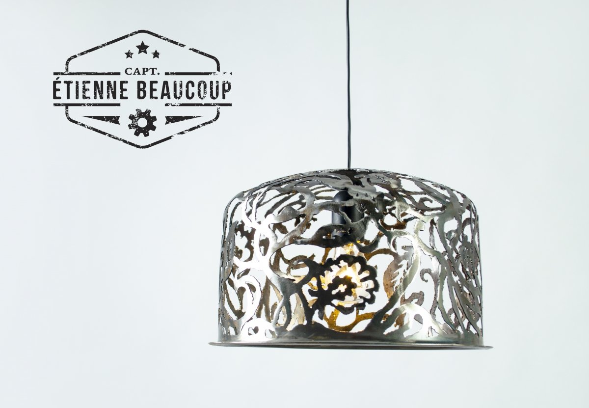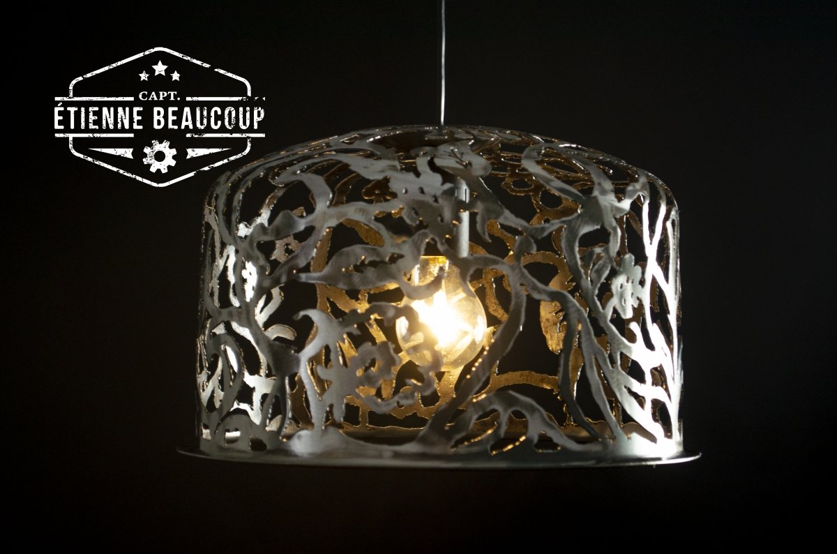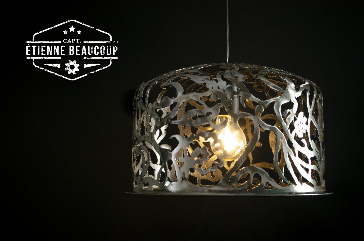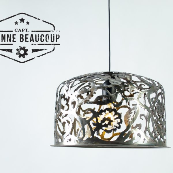 Deze hanglamp werd met de hand uit de helft een gerecupereerd expansievat gesneden.