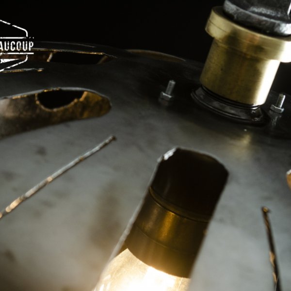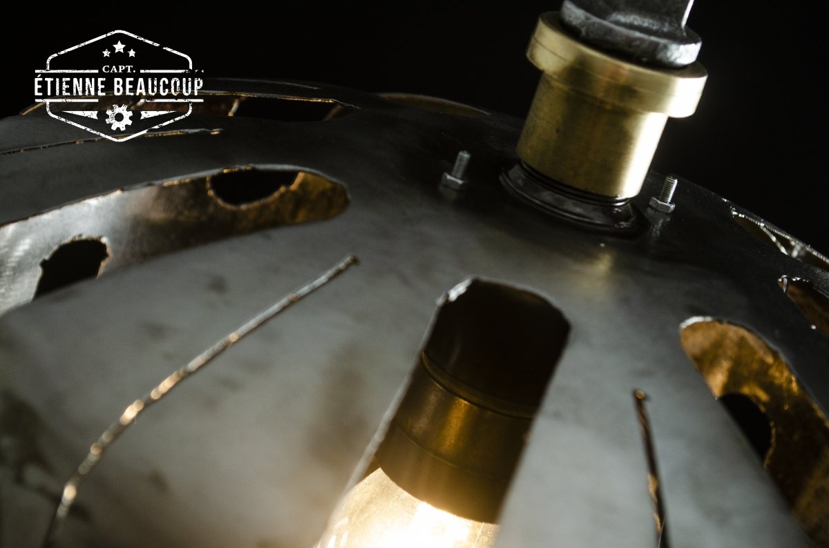 Deze hanglamp werd met de hand uit de helft een gerecupereed expansievag gesneden.