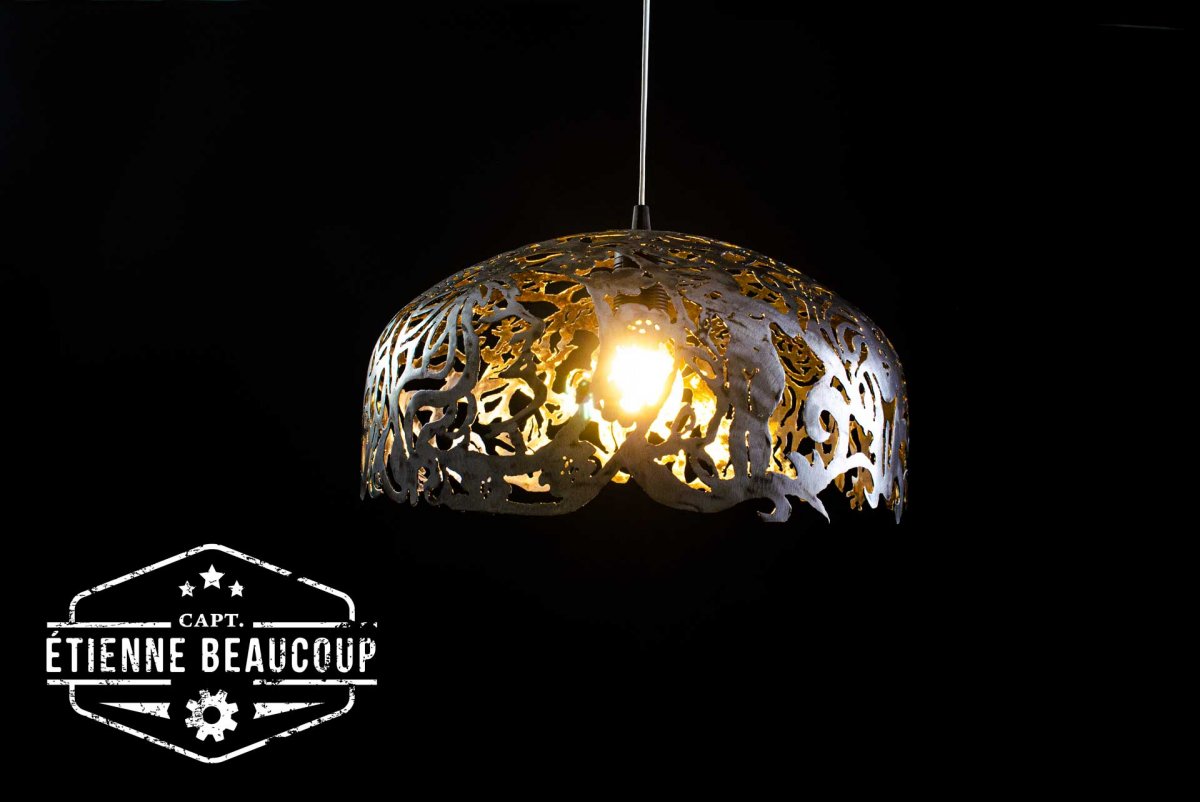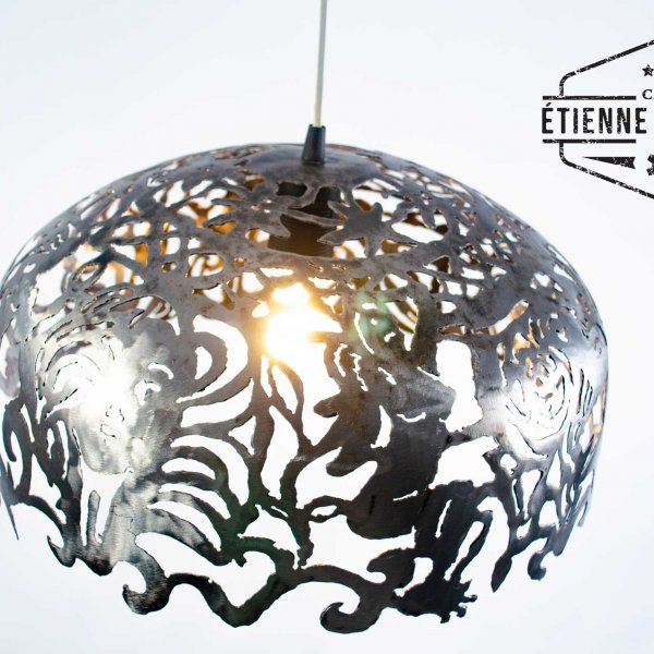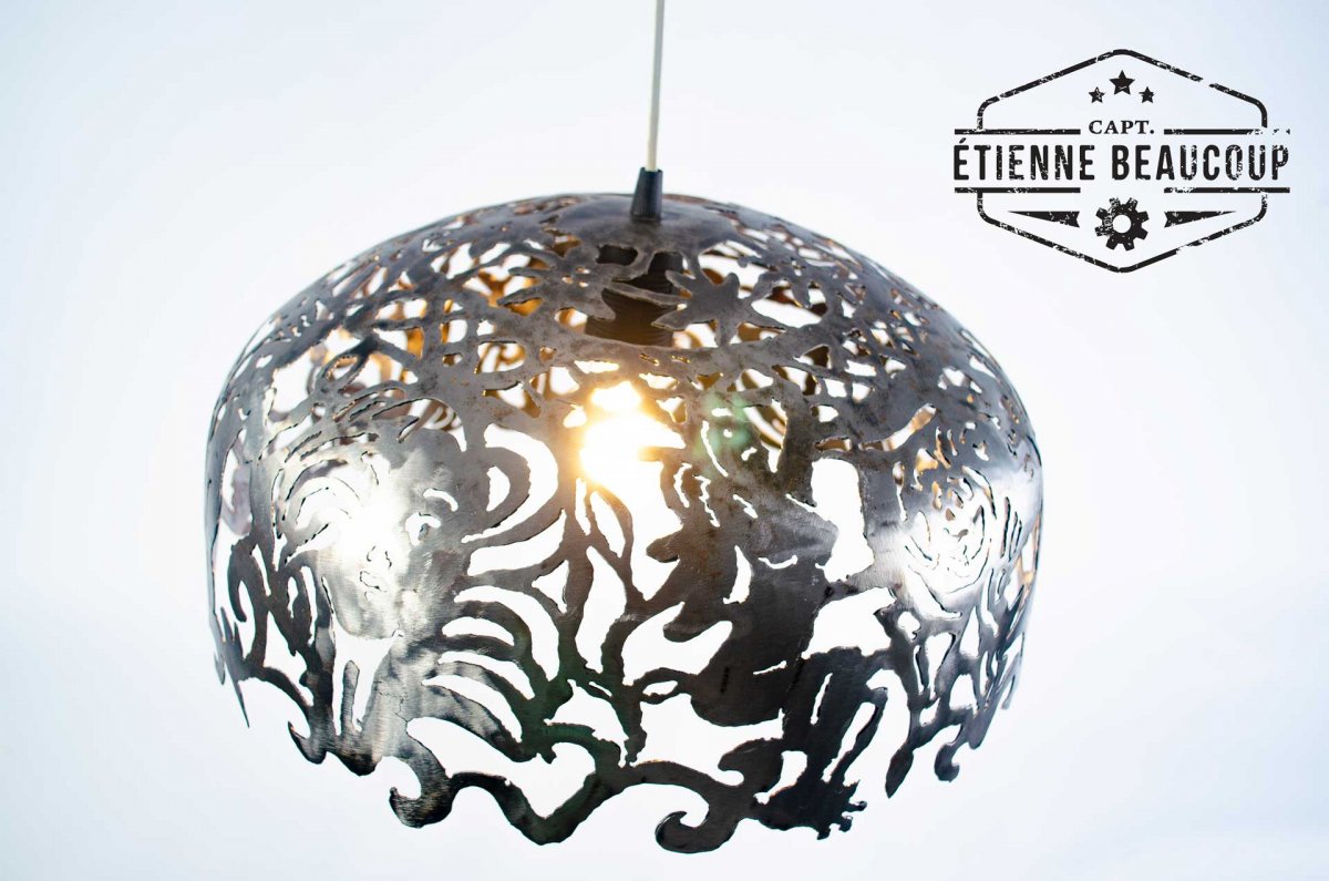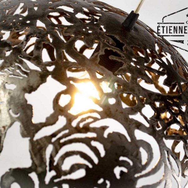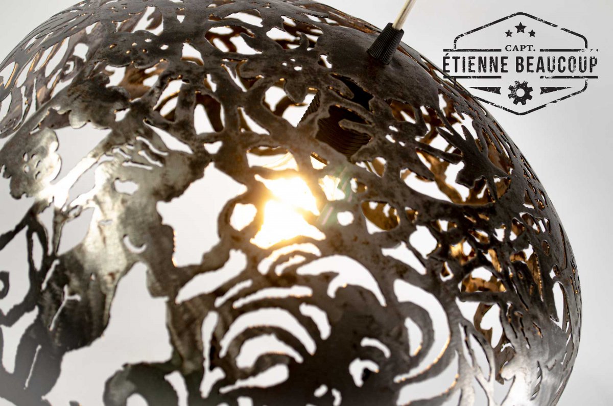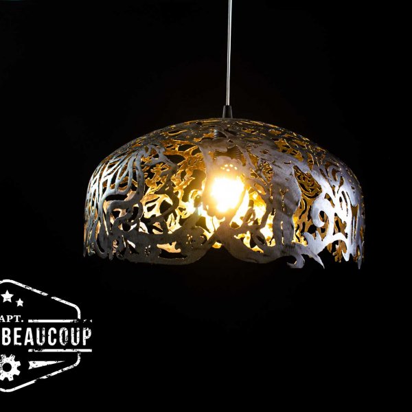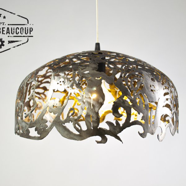 Deze hanglamp werd met de hand uitgesneden uit de helft van een oud expansievat.