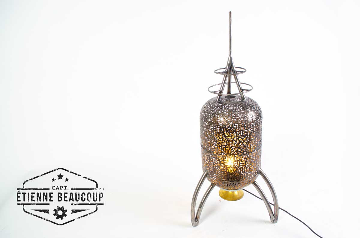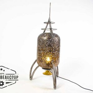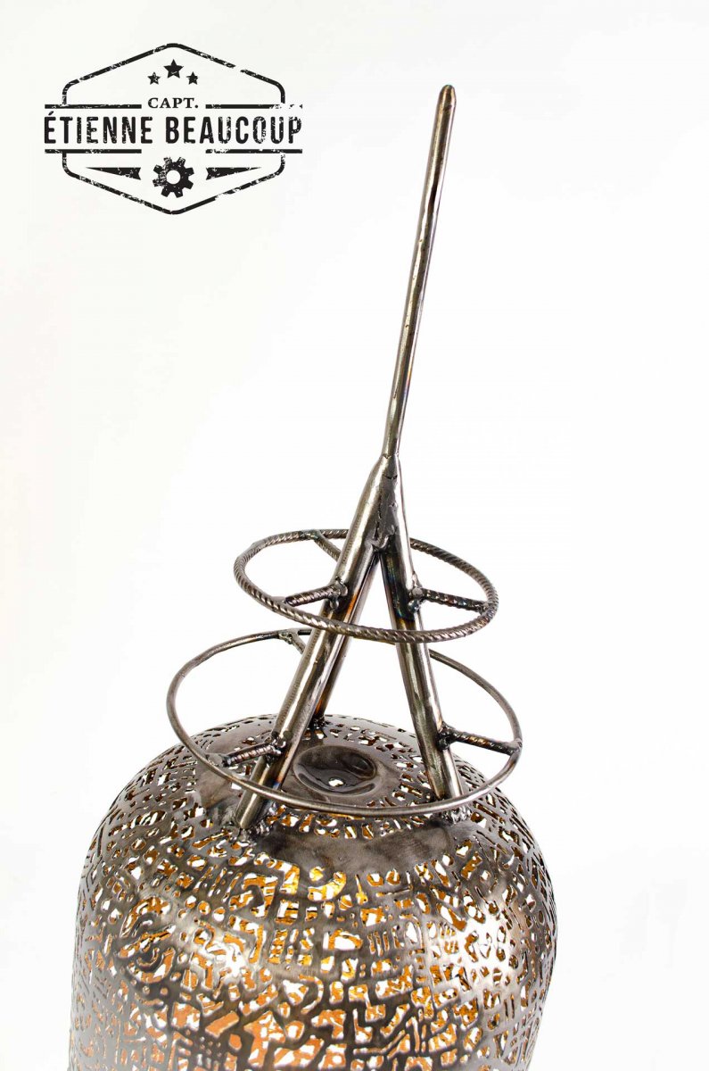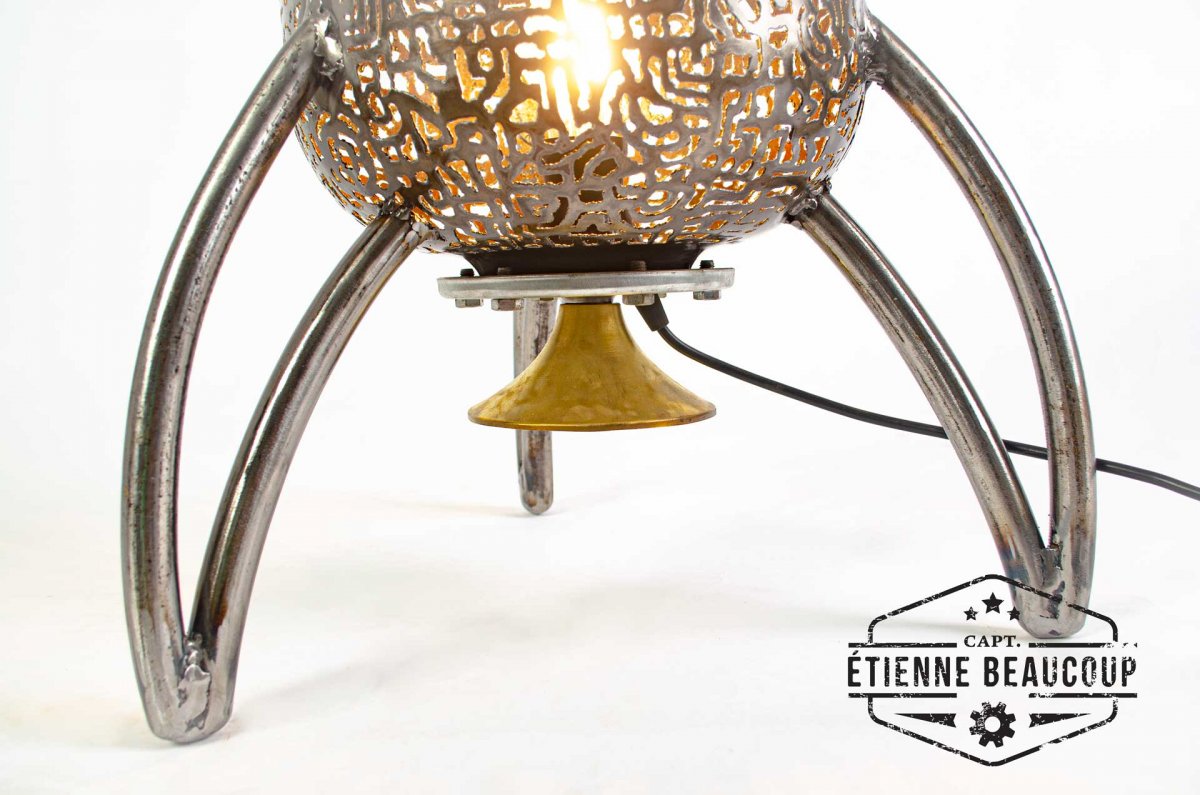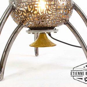 Deze retrofuturistische sfeerlamp is opgebouwd uit een oude expansievat. Het patroon is met de hand gesneden met een plasmasnijder en vertoont mechanische onderdelen. De lamp is afgewerkt met een oud koperen plafondkap van een kroonluchter.