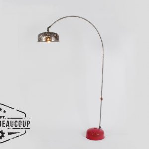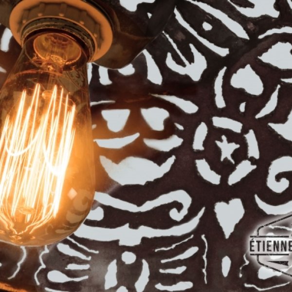 Strakke hanglamp uit een oud expansievat met een fifties spaceage patroon.