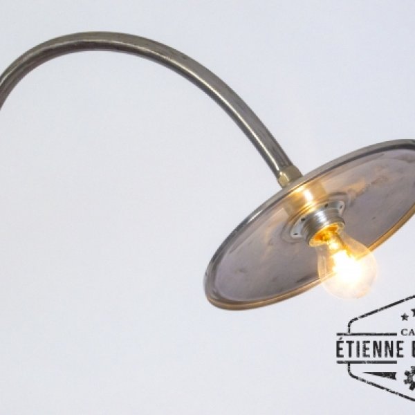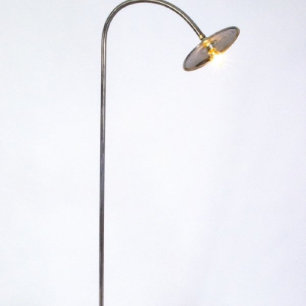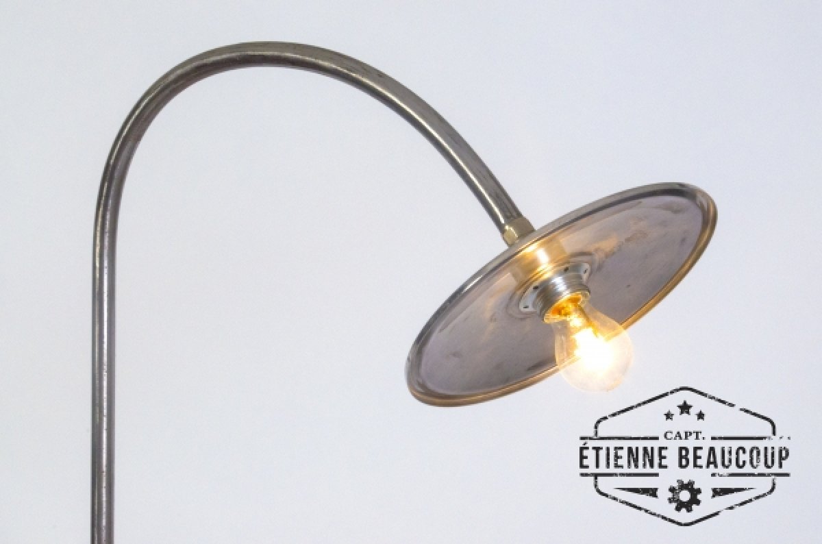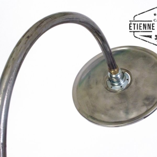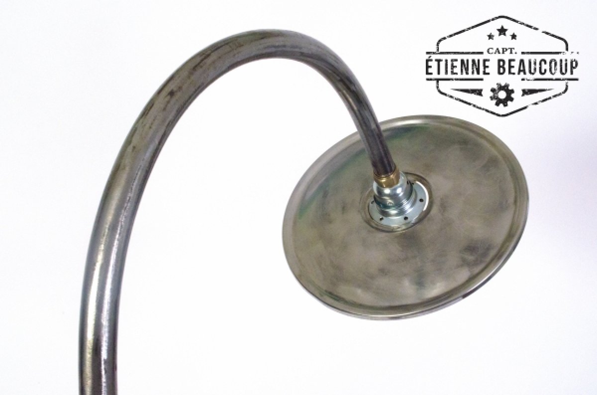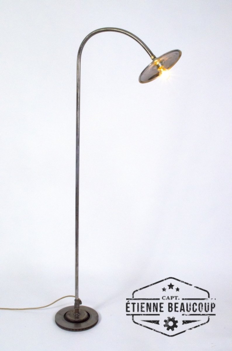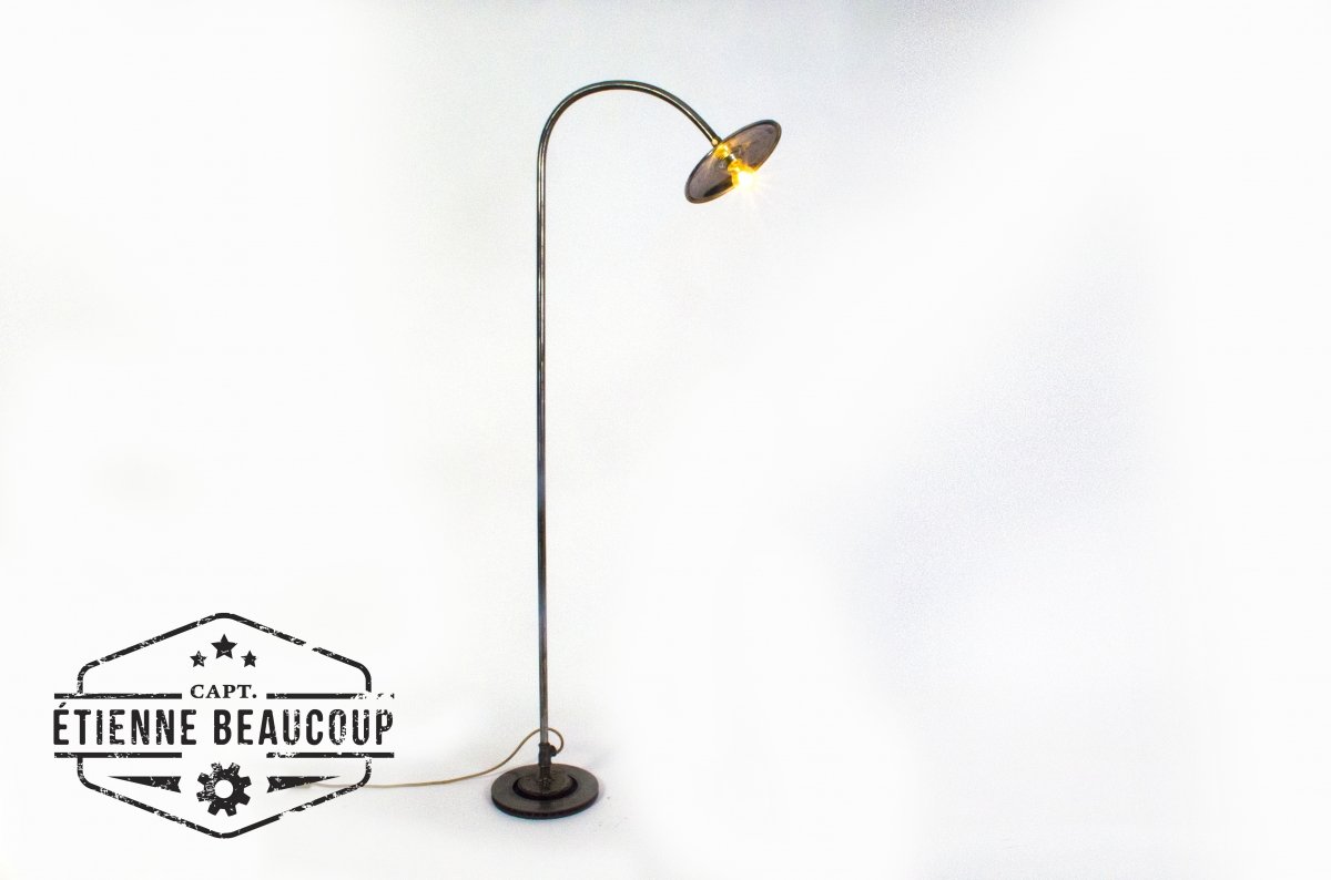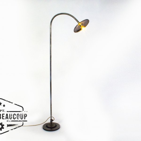 This florlamp is build out of scrapmetal. the lampmirror is alid of a cooking pot, the arm in an old plumbing pipe and the base a a worn brake of a car