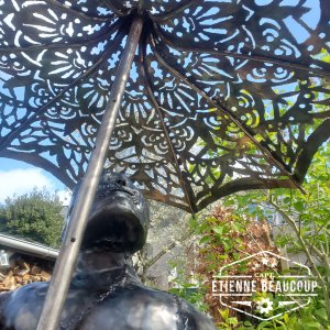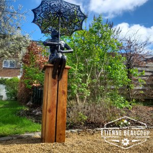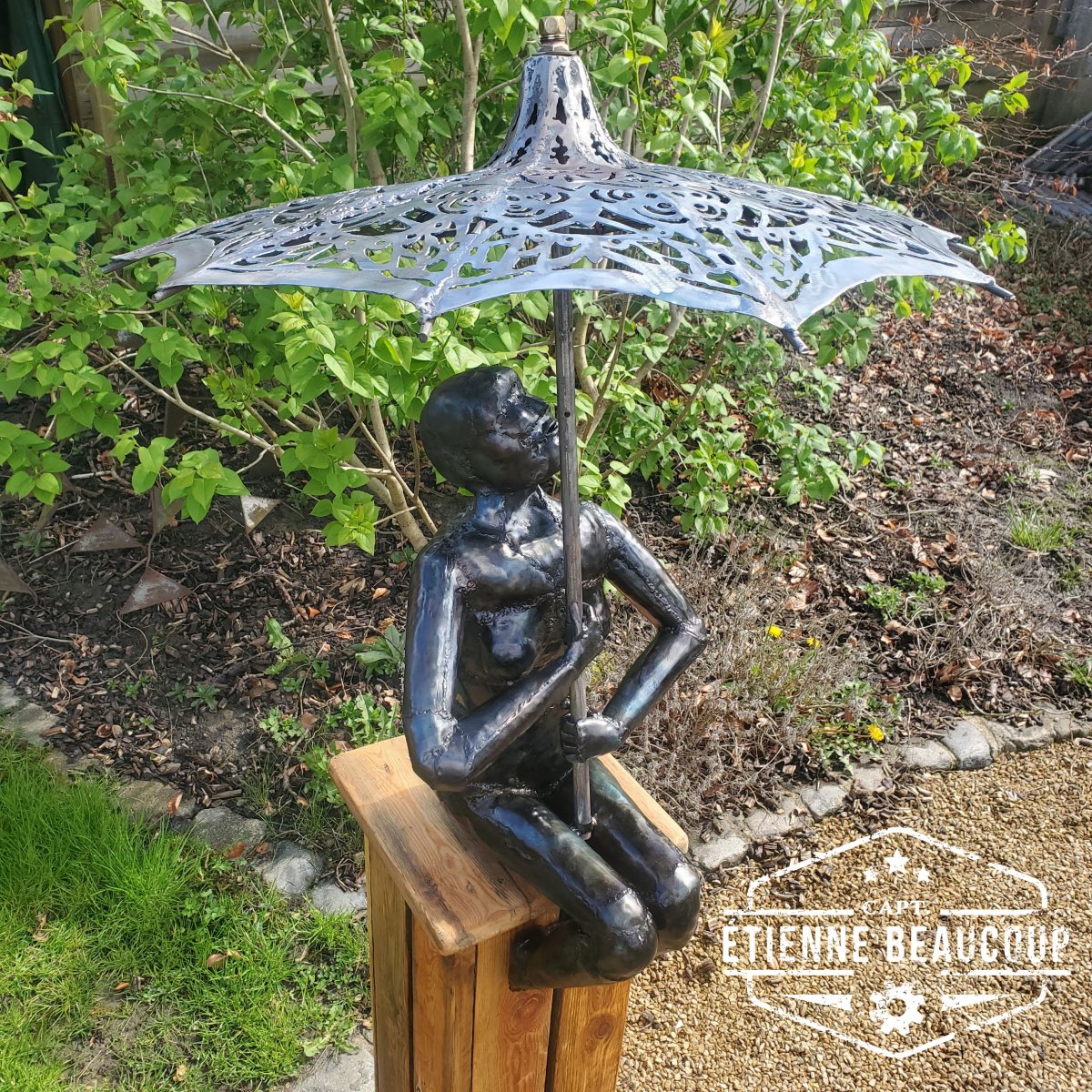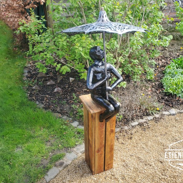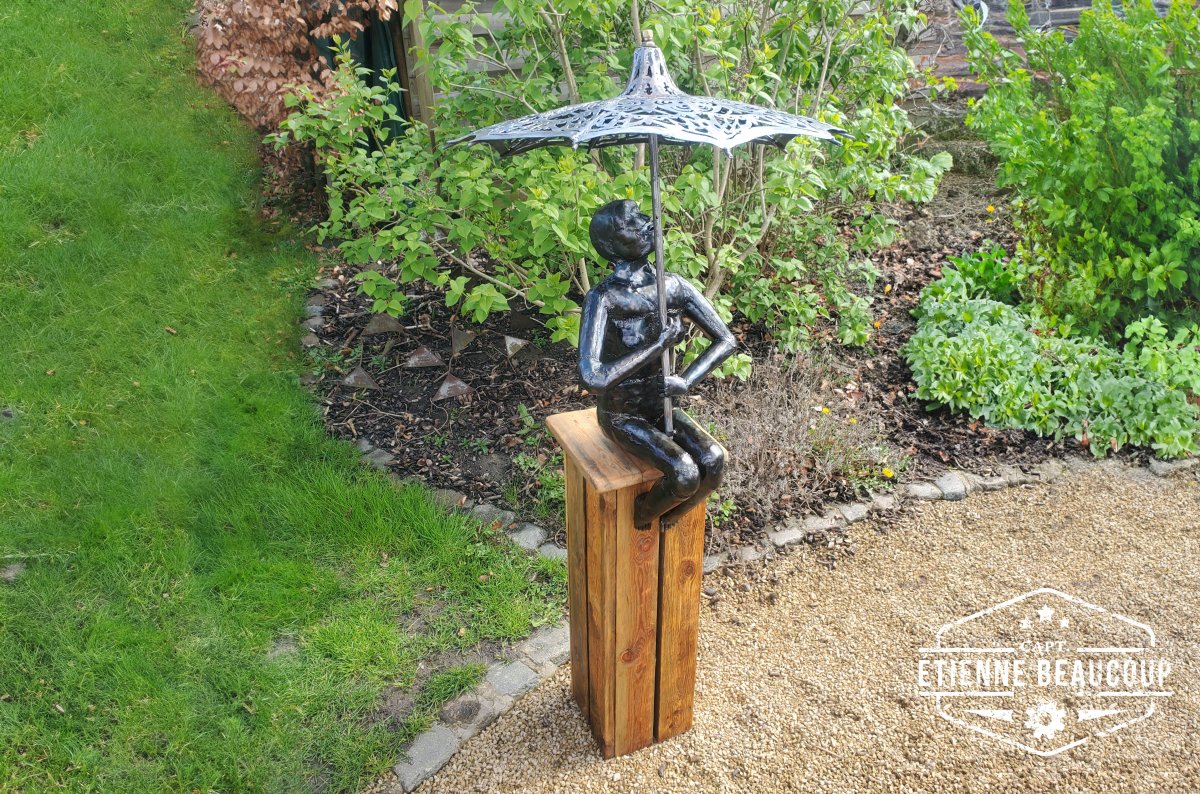 Dit sculptuur is opgebouwd uit gereupereerd staalplaat ingewreven met olie waardoor het een donkere kleur krijgt.