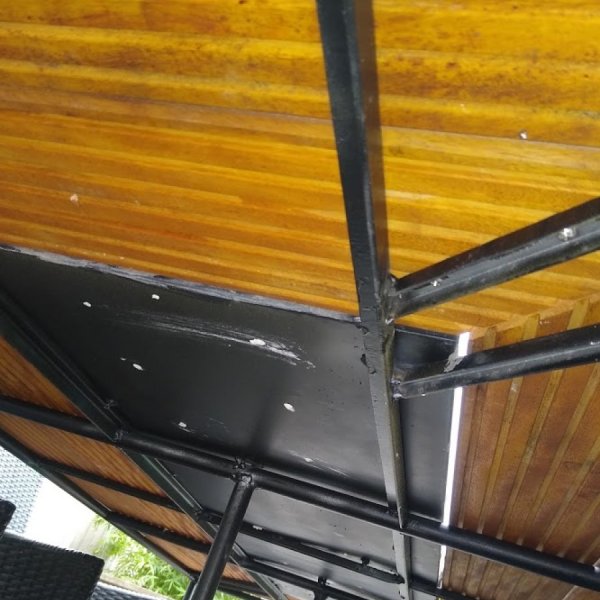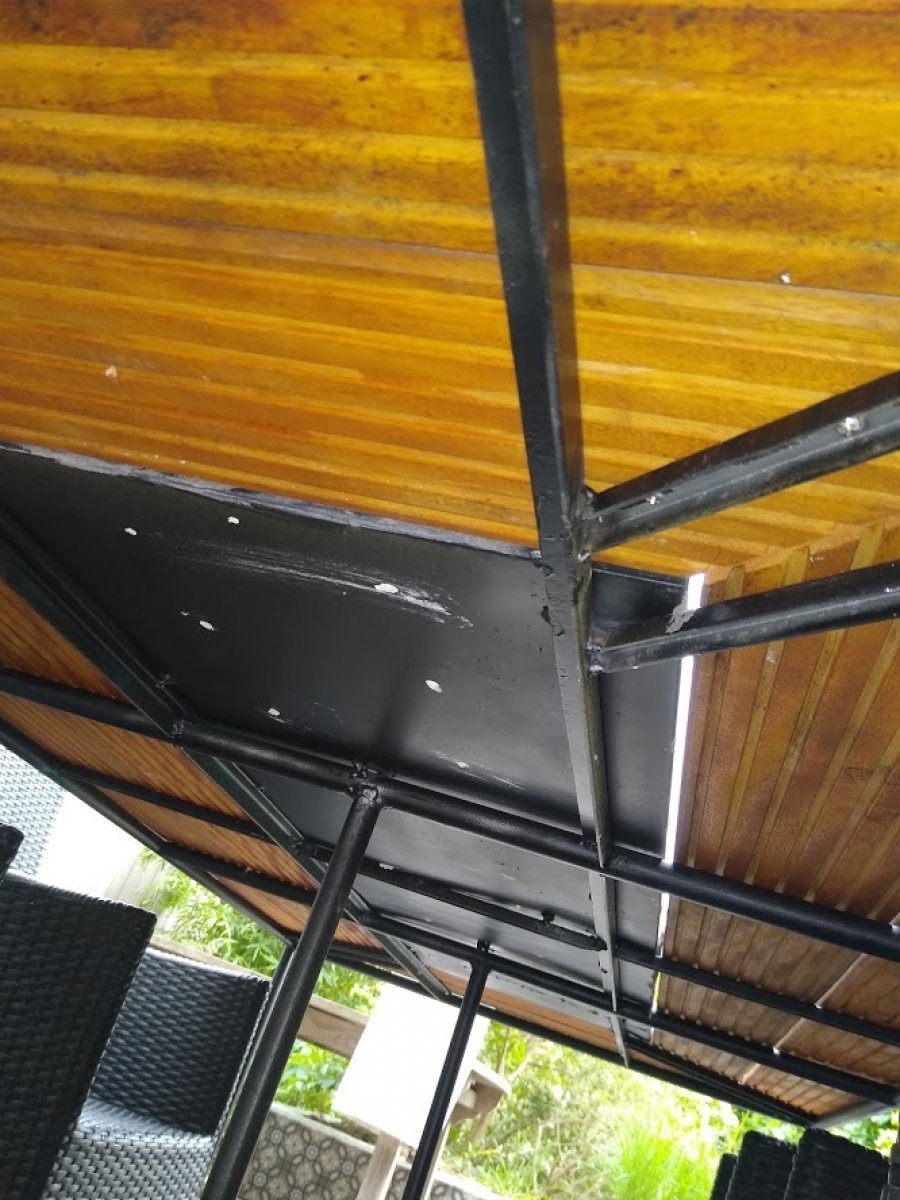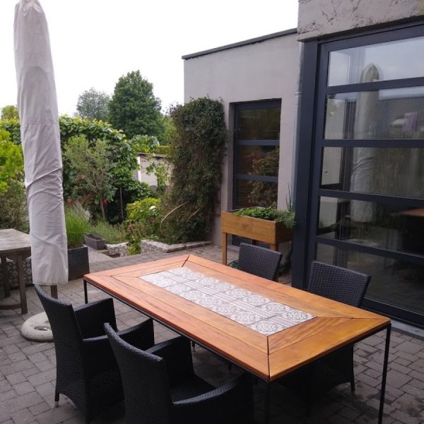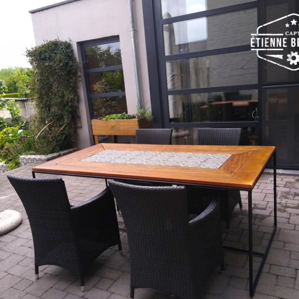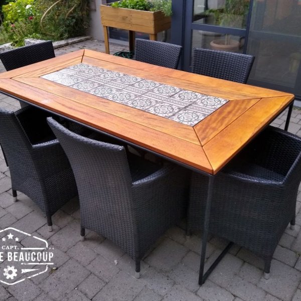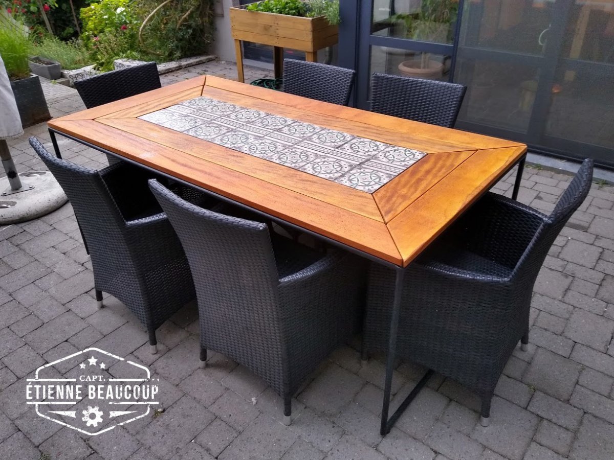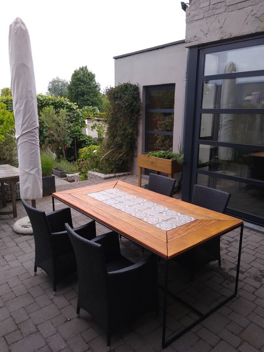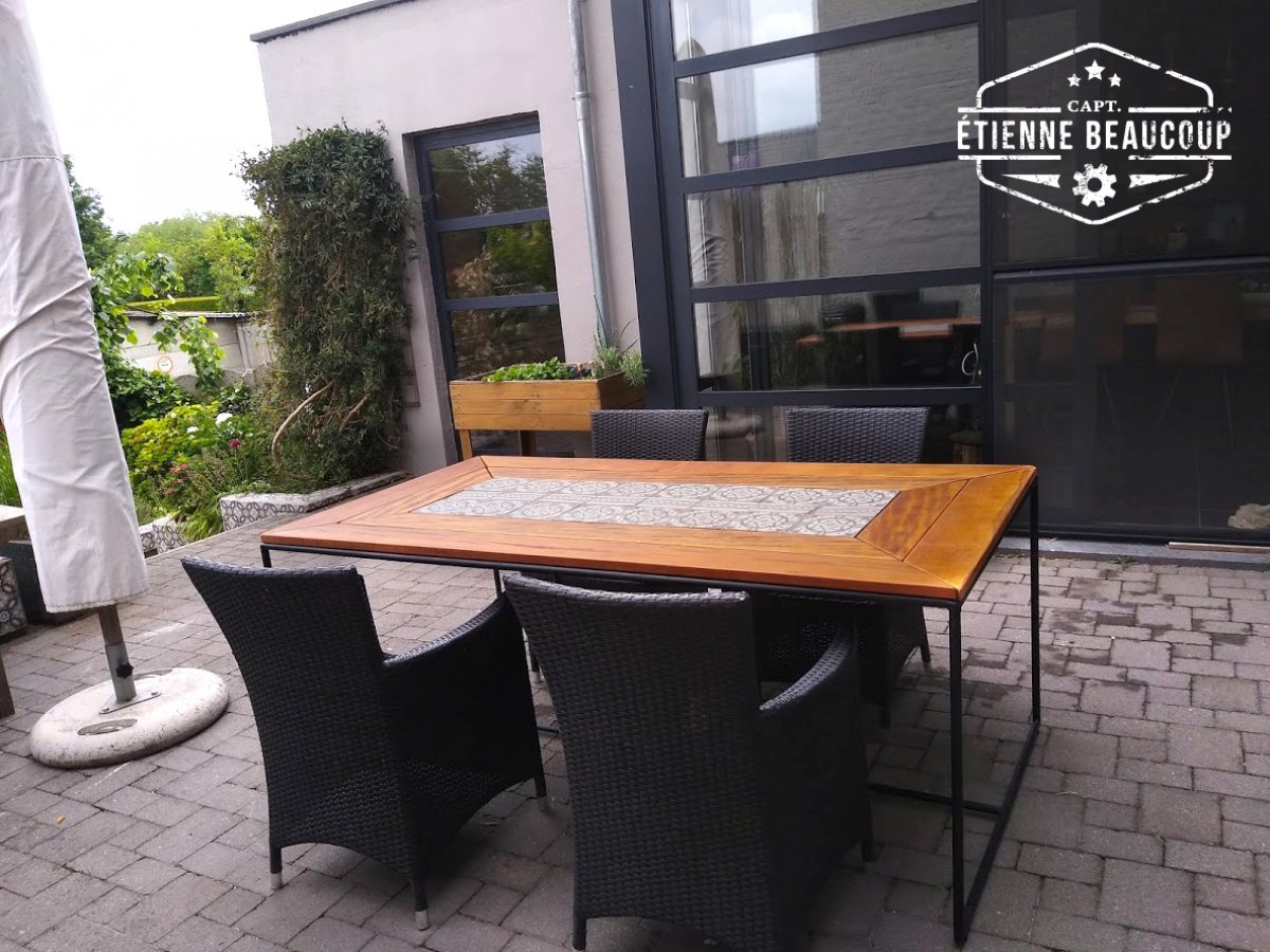 Tuintafel gemaakt uit verwarmingsbuizen,recuperatie terrasplanken en oude cementtegels.